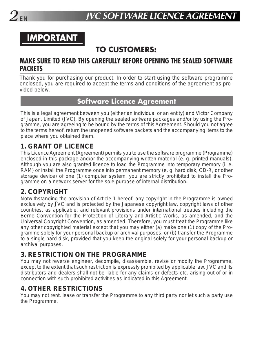 JVC SOFTWARE LICENCE AGREEMENT EN IMPORTANT TO CUSTOMERS: MAKE SURE TO READ THIS CAREFULLY BEFORE OPENING THE SEALED SOFTWARE PACKETS Thank you for purchasing our product. In order to start using the software programme enclosed, you are required to accept the terms and conditions of the agreement as provided below.