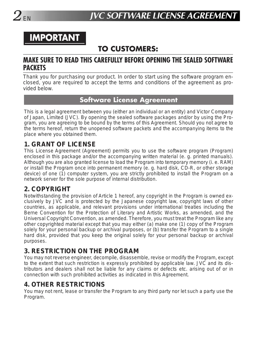 EN JVC SOFTWARE LICENSE AGREEMENT IMPORTANT TO CUSTOMERS: MAKE SURE TO READ THIS CAREFULLY BEFORE OPENING THE SEALED SOFTWARE PACKETS Thank you for purchasing our product. In order to start using the software program enclosed, you are required to accept the terms and conditions of the agreement as provided below.