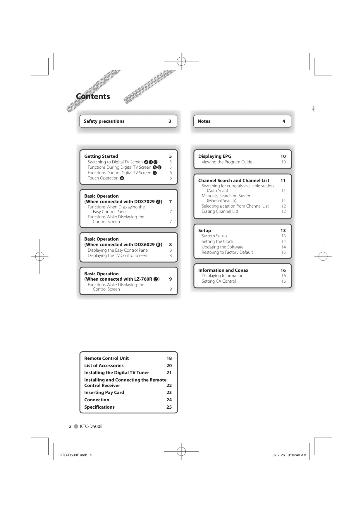 18 List of Accessories 20 Installing the Digital TV Tuner 21 Installing and Connecting the Remote Control Receiver 22 Inserting Pay Card 23 Connection 24 Specifications 25