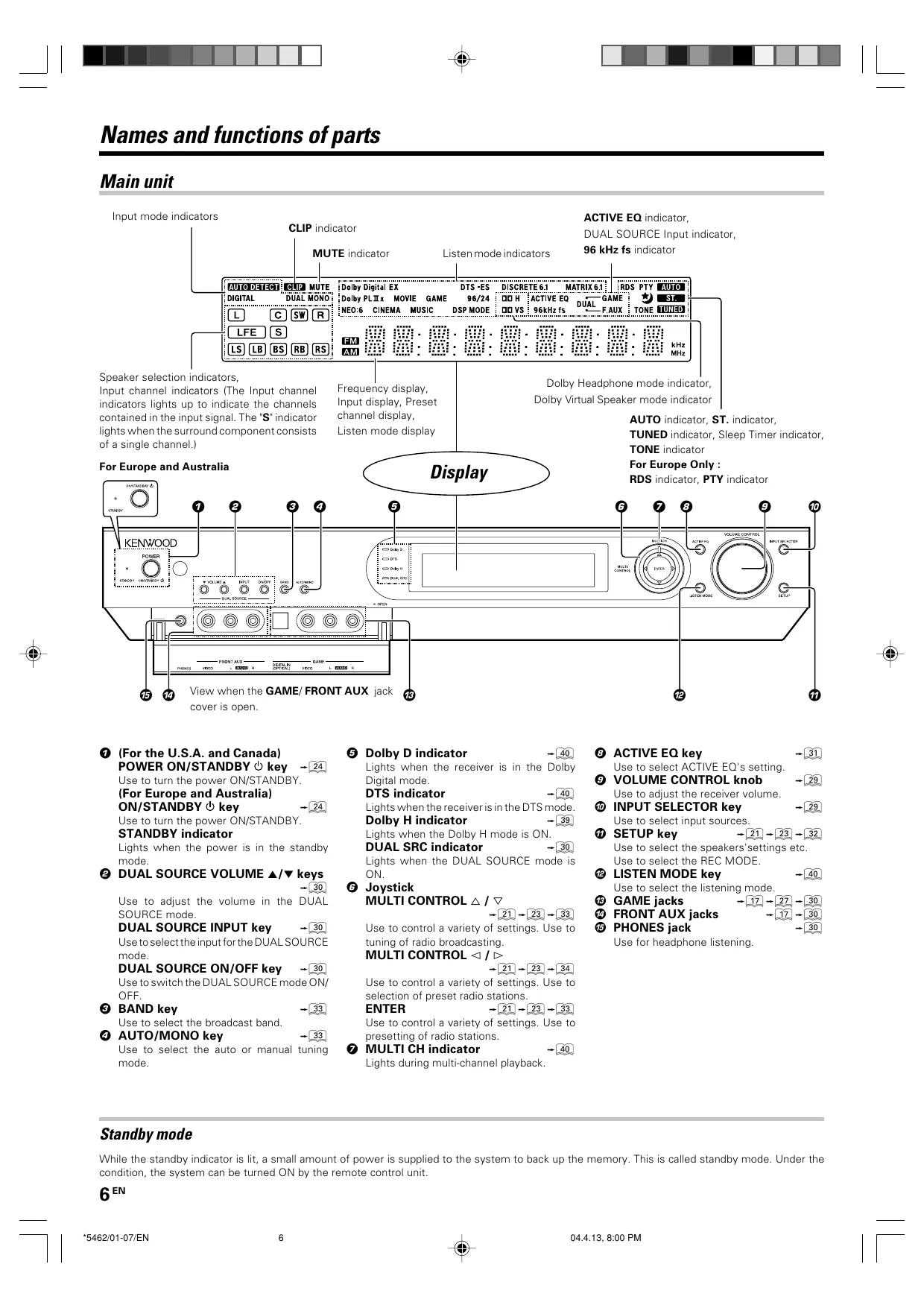 © ACTIVE EQ key Use to select ACTIVE EQ's setting © VOLUME CONTROL knob Use to adjust the receiver volume. © INPUT SELECTOR key Use to select input sources. @ SETUP key -(9-09 -62 Use to select the speakers'settings etc. Use to select the REC MODE @ LISTEN MODE key -(0 Use to select the listening mode. @ GAME jacks @ FRONT AUX jacks © PHONES jack Use for headphone listening, While the standby indicator is lit, a small amount of power is supplied to the system to back up the memory. This is called standby mode. Under the condition, the system can be turned ON by the remote control unit 6“\ ”] | *5462/01-07/EN 6 044.18, 8:00 PM