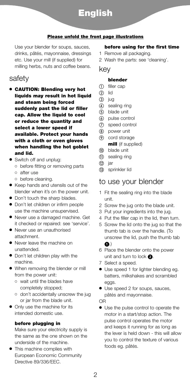 1 Fit the sealing ring into the blade unit. 2 Screw the jug onto the blade unit. 3 Put your ingredients into the jug. 4 Put the filler cap in the lid, then turn. 5 Screw the lid onto the jug so that the thumb tab is over the handle. (To unscrew the lid, push the thumb tab .) 6 Place the blender onto the power unit and turn to lock . 7 Select a speed. ● Use speed 1 for lighter blending eg. batters, milkshakes and scrambled eggs. ● Use speed 2 for soups, sauces, pâtés and mayonnaise. OR ● Use the pulse control to operate the motor in a start/stop action. The pulse control operates the motor and keeps it running for as long as the lever is held down - this will allow you to control the texture of various foods eg. pâtés.