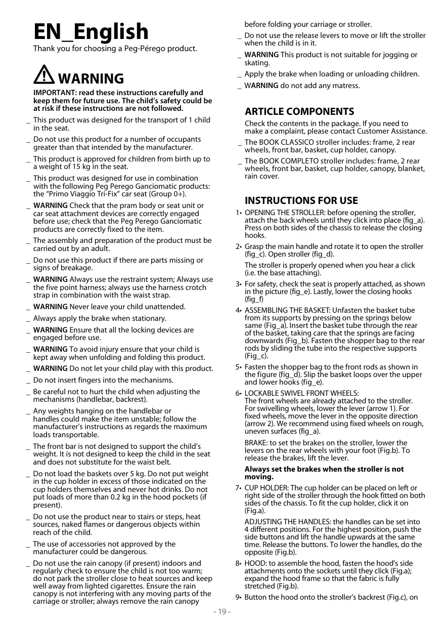 1• OPENING THE STROLLER: before opening the stroller, attach the back wheels until they click into place (fig_a). Press on both sides of the chassis to release the closing hooks. 2• Grasp the main handle and rotate it to open the stroller (fig_c). Open stroller (fig_d). The stroller is properly opened when you hear a click (i.e. the base attaching). 3• For safety, check the seat is properly attached, as shown in the picture (fig_e). Lastly, lower the closing hooks (fig_f) 4• ASSEMBLING THE BASKET: Unfasten the basket tube from its supports by pressing on the springs below same (Fig_a). Insert the basket tube through the rear of the basket, taking care that the springs are facing downwards (Fig_b). Fasten the shopper bag to the rear rods by sliding the tube into the respective supports (Fig_c). 5• Fasten the shopper bag to the front rods as shown in the figure (fig_d). Slip the basket loops over the upper and lower hooks (fig_e). 6• LOCKABLE SWIVEL FRONT WHEELS: The front wheels are already attached to the stroller. For swivelling wheels, lower the lever (arrow 1). For fixed wheels, move the lever in the opposite direction (arrow 2). We recommend using fixed wheels on rough, uneven surfaces (fig_a). BRAKE: to set the brakes on the stroller, lower the levers on the rear wheels with your foot (Fig.b). To release the brakes, lift the lever. Always set the brakes when the stroller is not moving. 7• CUP HOLDER: The cup holder can be placed on left or right side of the stroller through the hook fitted on both sides of the chassis. To fit the cup holder, click it on (Fig.a). ADJUSTING THE HANDLES: the handles can be set into 4 different positions. For the highest position, push the side buttons and lift the handle upwards at the same time. Release the buttons. To lower the handles, do the opposite (Fig.b). 8• HOOD: to assemble the hood, fasten the hood's side attachments onto the sockets until they click (Fig.a); expand the hood frame so that the fabric is fully stretched (Fig.b). 9• Button the hood onto the stroller's backrest (Fig.c), on