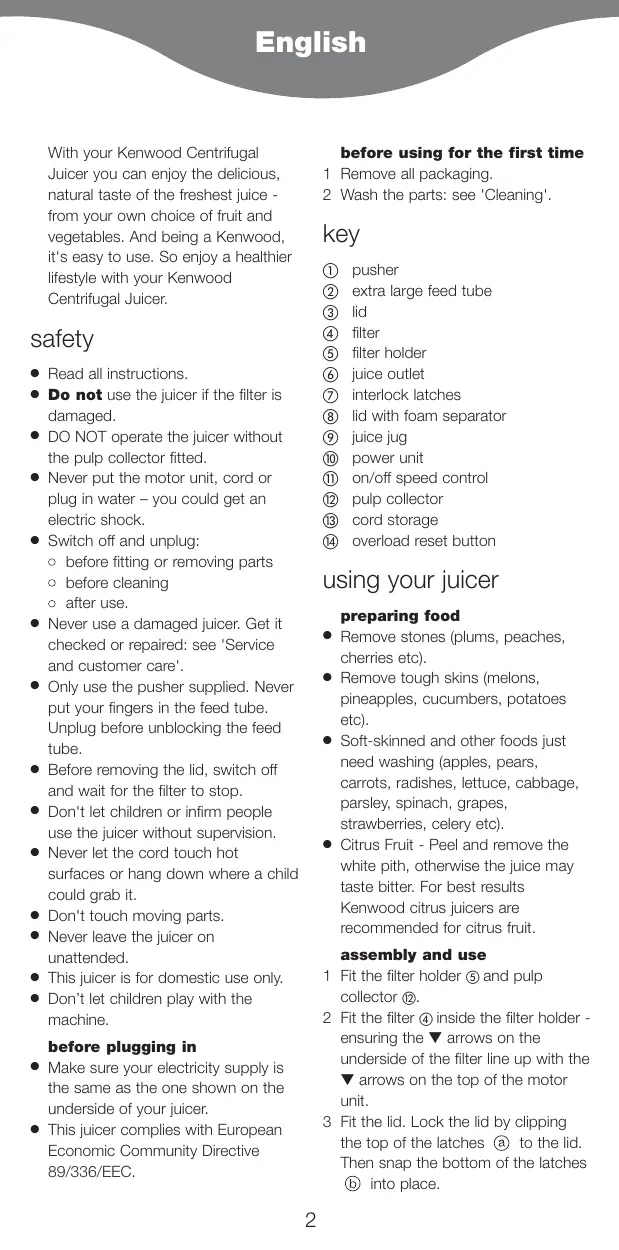 before plugging in Make sure your electricity supply is the same as the one shown on the underside of your juicer. This juicer complies with European Economic Community Directive 89/336/EEC.