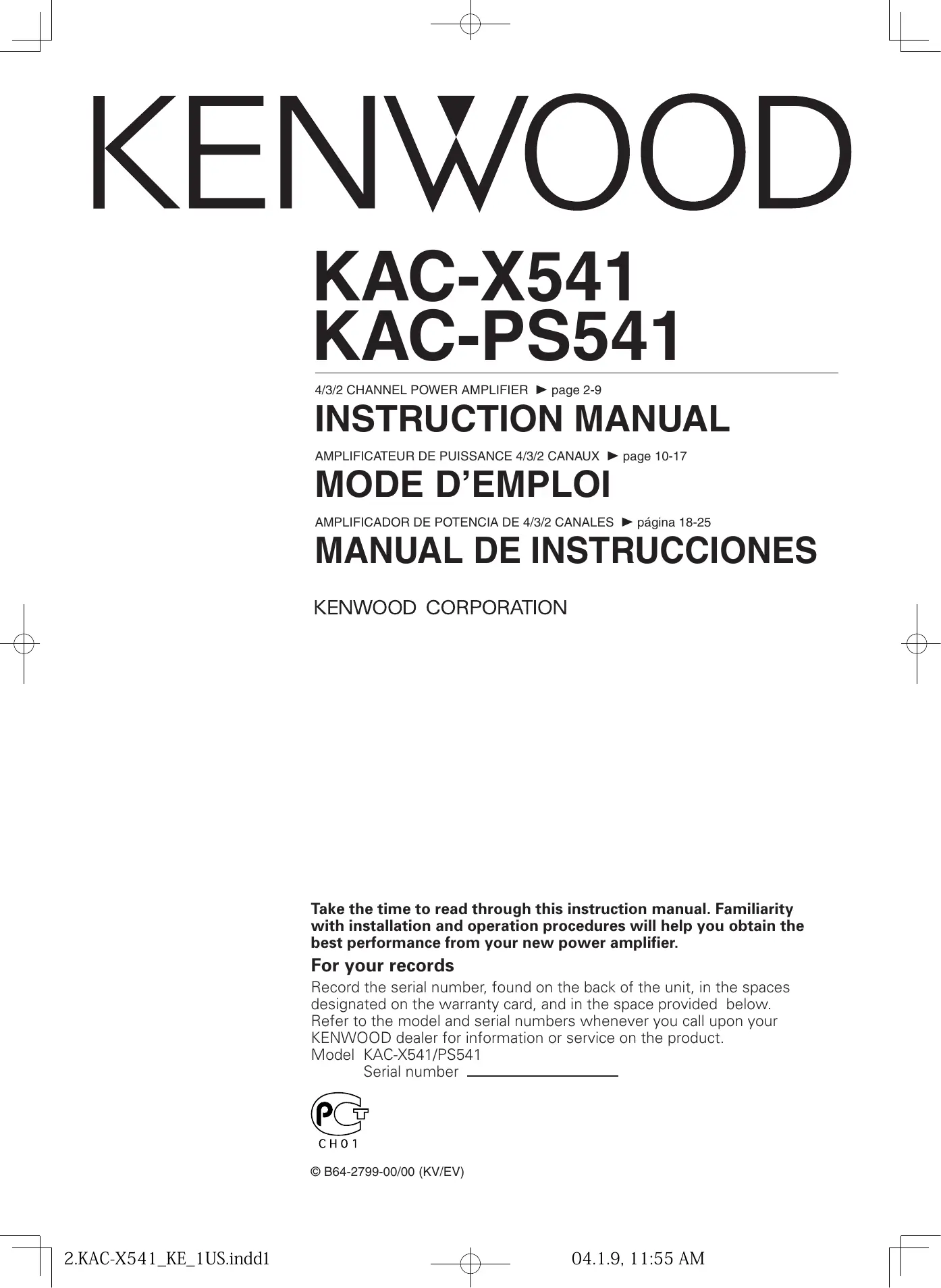 Take the time to read through this instruction manual. Familiarity with installation and operation procedures will help you obtain the best performance from your new power amplifier. For your records Record the serial number, found on the back of the unit, in the spaces designated on the warranty card, and in the space provided below. Refer to the model and serial numbers whenever you call upon your KENWOOD dealer for information or service on the product. Model KAC-X541/PS541 Serial number © B64-2799-00/00 (KV/EV) Safety precautions Cleaning the unit 2WARNING If the front panel gets dirty, turn off the power and wipe the panel with a dry silicon cloth or soft cloth. To prevent injury or fire, take the following precautions: