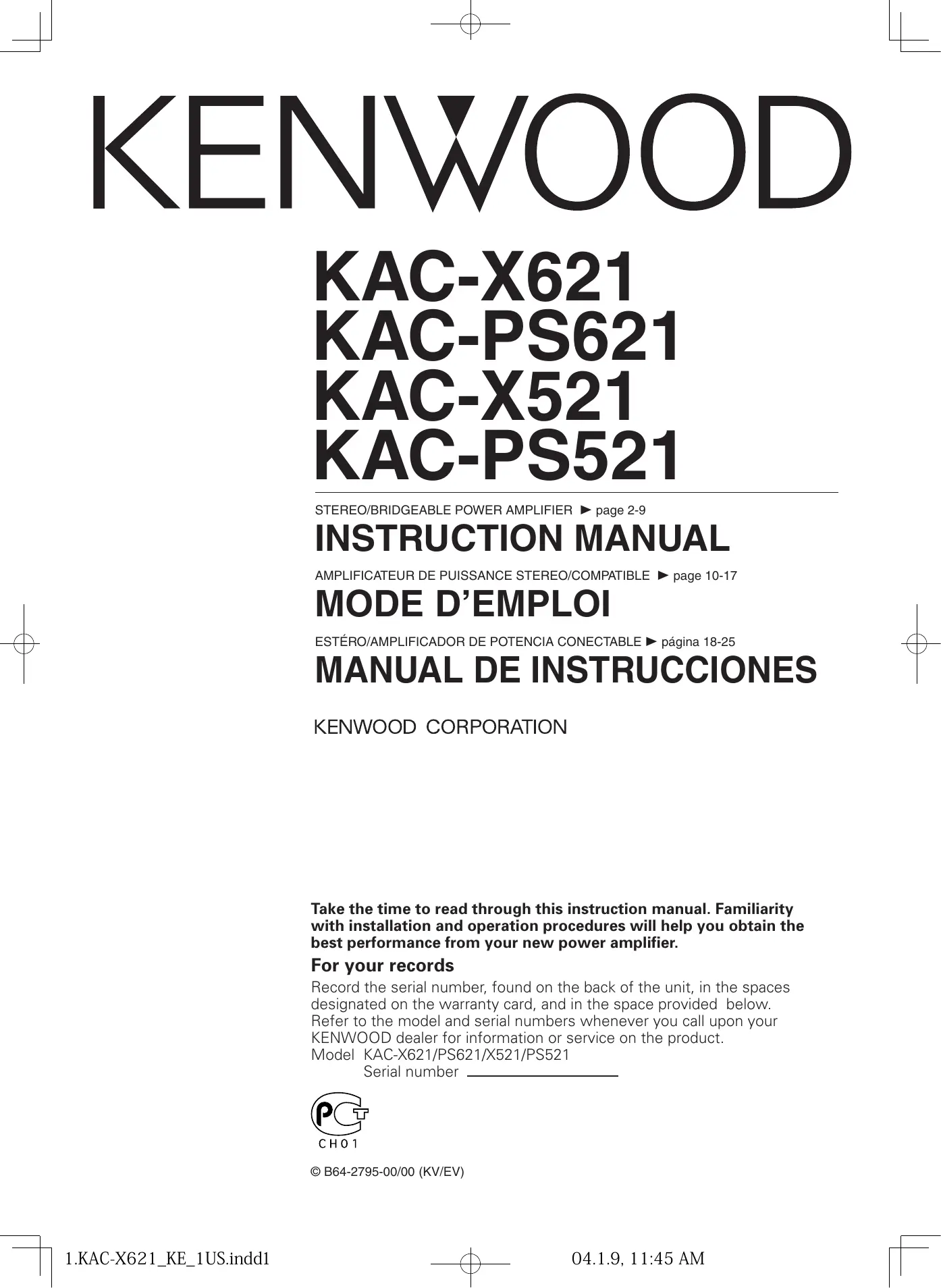 Take the time to read through this instruction manual. Familiarity with installation and operation procedures will help you obtain the best performance from your new power amplifier. For your records Record the serial number, found on the back of the unit, in the spaces designated on the warranty card, and in the space provided below. Refer to the model and serial numbers whenever you call upon your KENWOOD dealer for information or service on the product. Model KAC-X621/PS621/X521/PS521 Serial number © B64-2795-00/00 (KV/EV) Safety precautions Cleaning the unit 2WARNING If the front panel gets dirty, turn off the power and wipe the panel with a dry silicon cloth or soft cloth. To prevent injury or fire, take the following precautions: