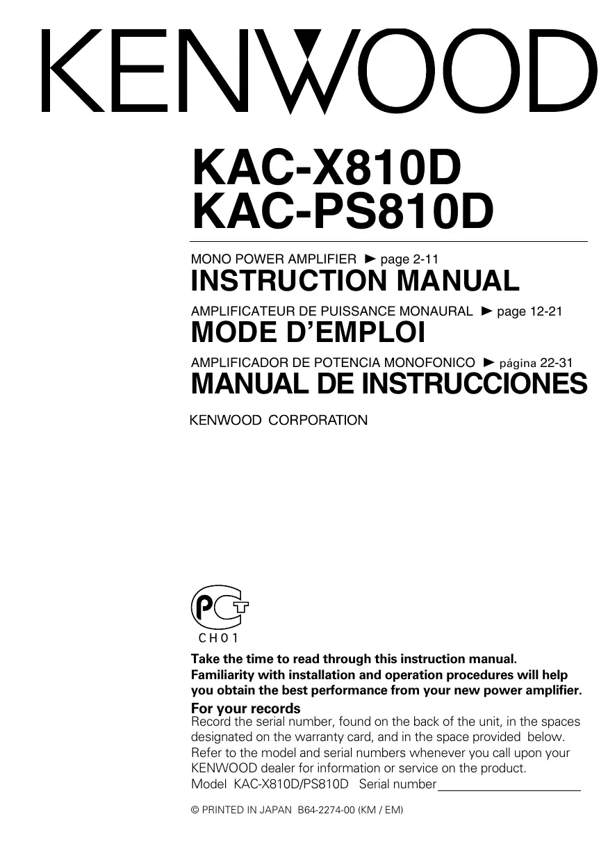 Take the time to read through this instruction manual. Familiarity with installation and operation procedures will help you obtain the best performance from your new power amplifier. For your records Record the serial number, found on the back of the unit, in the spaces designated on the warranty card, and in the space provided below. Refer to the model and serial numbers whenever you call upon your KENWOOD dealer for information or service on the product. Model KAC-X810D/PS810D Serial number © PRINTED IN JAPAN B64-2274-00 (KM / EM) Safety precautions 2WARNING To prevent injury or fire, take the following precautions: