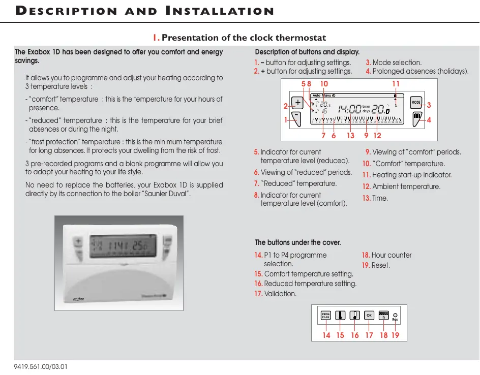 - température confort : c’est la température que vous souhaitez pendant vos heures de présence. - température économique : c’est la température que vous souhaitez pendant vos absences de courte durée ou pendant la nuit. - température hors-gel : c’est la température minimale assurée pendant vos absences prolongées. Elle protège votre logement des risques du gel. Ses 3 programmes préenregistrés et son programme libre vont vous permettre d’adapter votre chauffage à votre mode de vie. Facile d’entretien, votre Exabox 1J est alimenté directement par votre chaudière Saunier Duval.