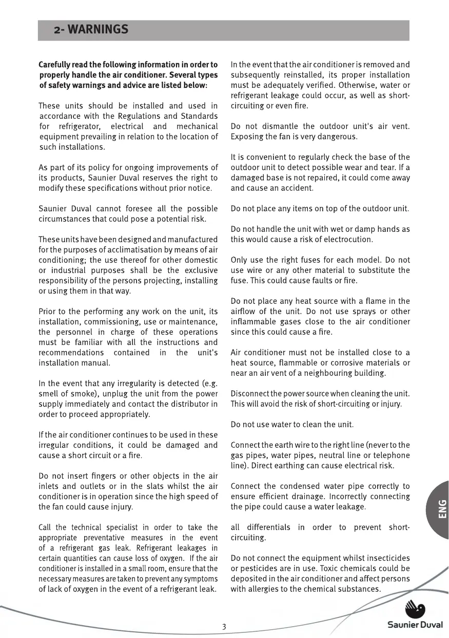 7.4- GENERAL CARE INSTRUCTIONS ENG If you are not intending to use the unit for a few days: Put the fan into operation for three or four hours in order to dry the inside of the unit; stop the unit and disconnect the magnetothermal switch; clean the air filters; and remove the batteries from the remote control. Before turning the unit back on, check the following: that the air filters are installed, that the air inlet and outlet are not blocked up, that the remote control is fitted with batteries and that the differential switch is connected. Occasionally check the base of the outdoor unit. If the base is damaged or deteriorated, the unit could fall down and cause physical or material damage. We advise you to contact a reliable air conditioner specialist or the Saunier Duval Official Technical Services to contract a preventative maintenance service. This will help to prolong the life of your air conditioner and improve its performance.
