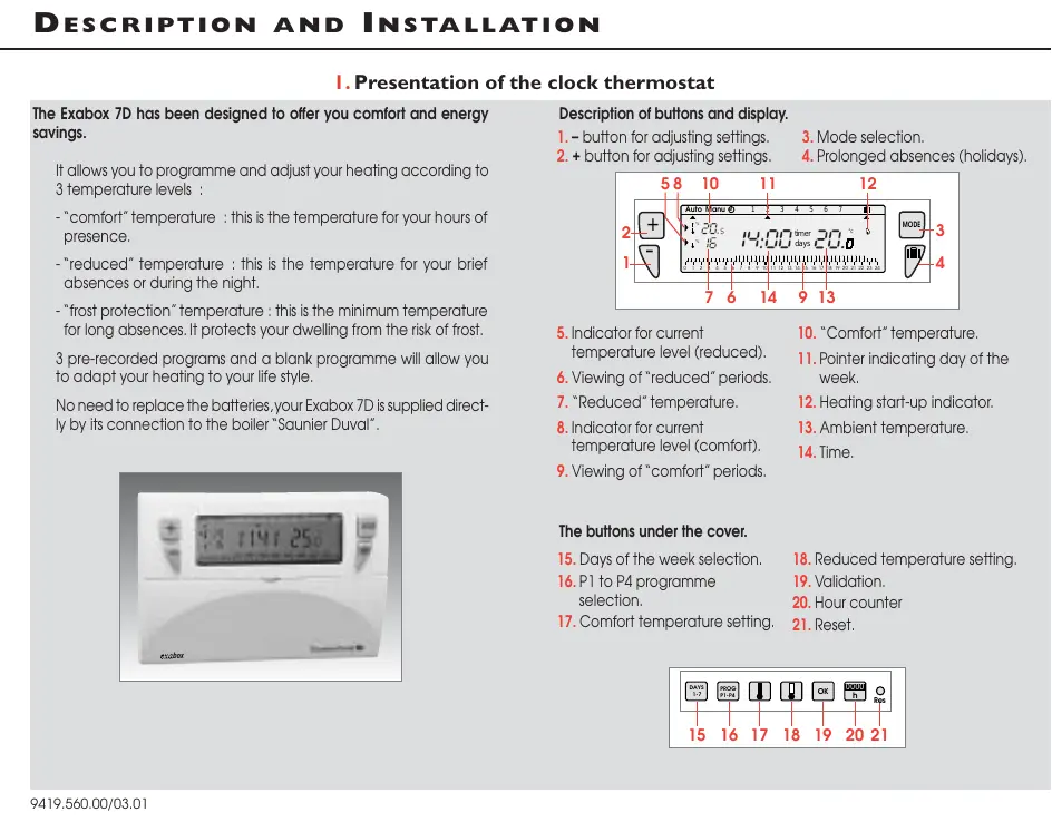 The Exabox 7D has been designed to offer you comfort and energy Description of buttons and display. savings. 1.-button for adjusting settings. 3. Mode selection. 2. + button for adjusting settings. 4. Prolonged absences (holidays). I alows you to programme and adjust Your heaïing according to 3 temperature levels : 58 10 11 12 "comfort" temperature : his is he temperature for your hours of EN presence * 1005005 ° "reduced" temperature : this is he temperature for your brief L A] nu 4 absences or during the night. + — . 6 14 913 -"frost protection" temperature :thiis ne minimum temperature forlong absences. protect your dweling from he risk of rost. $.Indicator for current 10. “Comfort” temperature. 3 pre-ecorded programs and a blank programme will allow you temperature level (reduced). 11. Pointerindicating day of the o adapt your heating to your fe style. 6. Viewing of"reduced'periods. week No need to replace the batteries, your Exabox 7D is supplied direct- 7."Reduced” temperature. 12. Heating start-up indicator. 1 by its connection to the boiler "Saunier Duval”. 8. Indicator for current 13. Ambient temperature. temperature level (comfort). 14 Time. 9. Viewing of "comfort" periock. The butions under the cover. 15. Days of he week selection. 18. Reduced temperature setting, 16.P1 to PA programme 19. Validation. selection 20.Hour counter