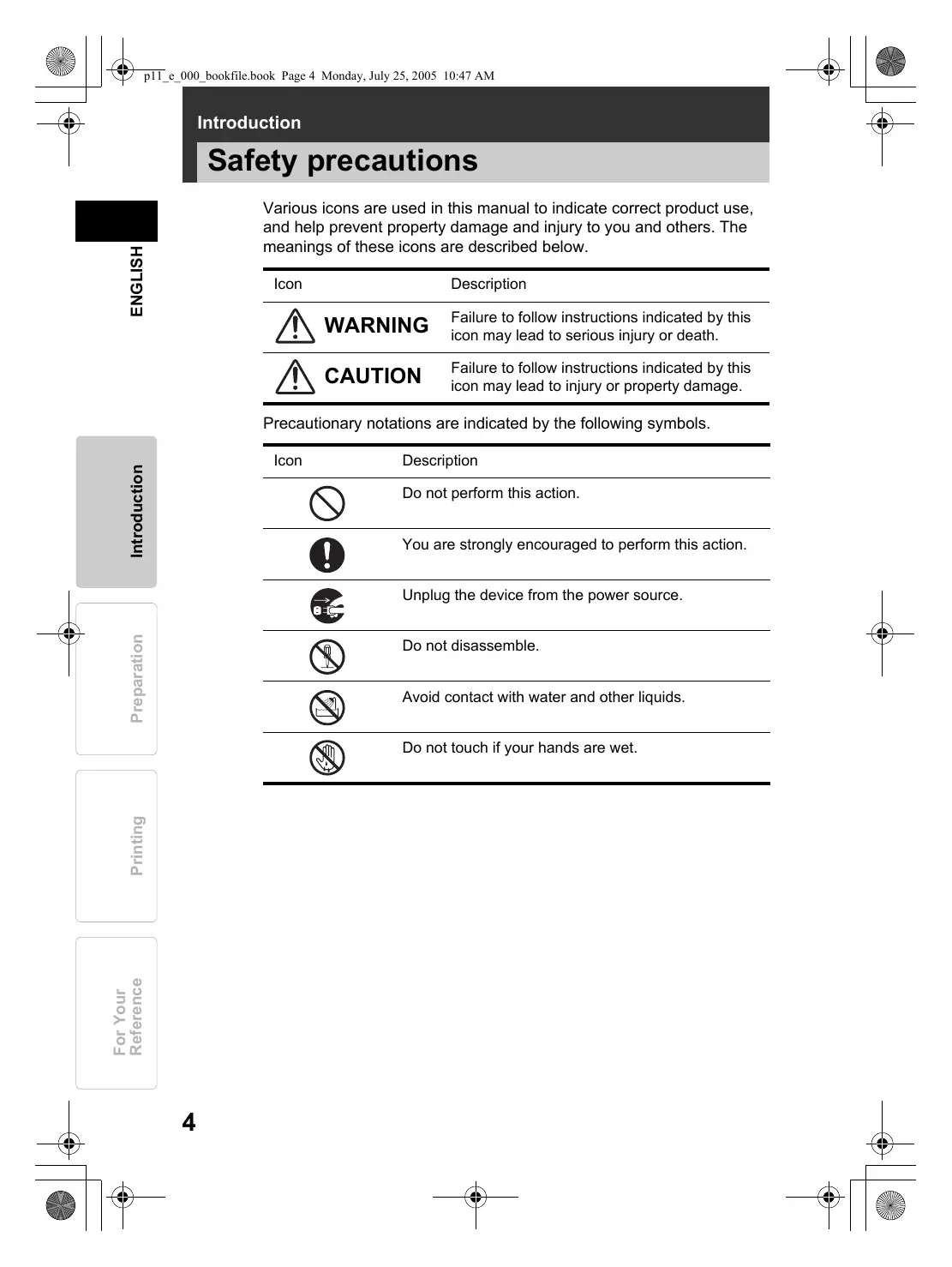 | CAUTION | Failure to follow instructions indicated by this icon may lead to injury or property damage. |
