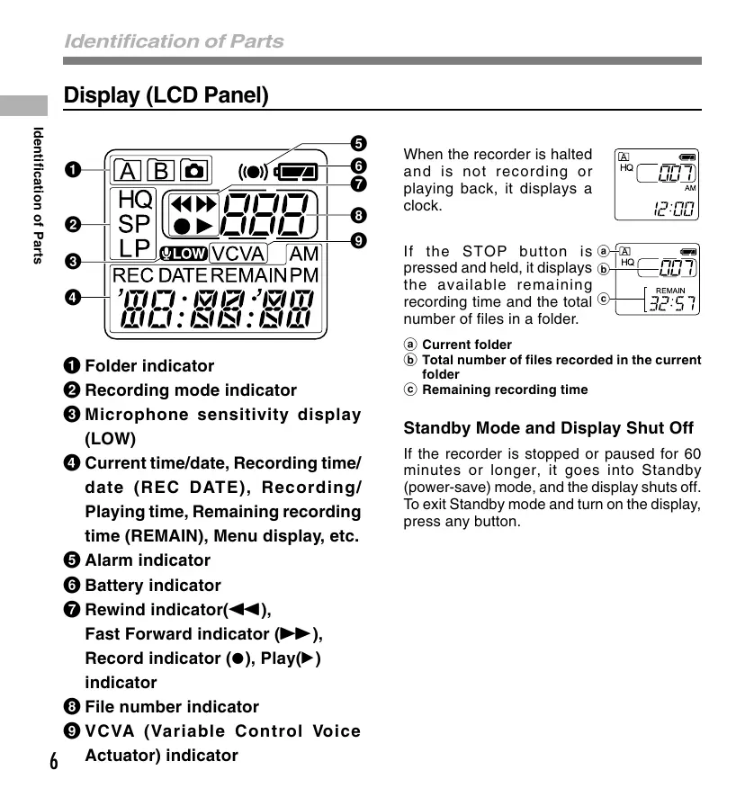 © Folder indicator @ Recording mode indicator © Microphone sensitivity display (Low) © Current time/date, Recording time/ date (REC DATE), Recording/ Playing time, Remaining recording time (REMAIN), Menu display, etc. @ Alarm indicator 6 Battery indicator @ Pevi dicator(-4«), Fast Forward indicator (b-), Record indicator (@), Play(>) indicator © File number indicator © VCVA (Variable Control Voice Actuator) indicator When the recorder is halted and is not recording or playing back, it displays a clock. If the STOP button is @- pressed and held, it displays @> the available remaining run recording time and the total CE: 67 number of files in a folder. @ Current folder ®) Total number of files recorded in the current folder © Remaining recording time Standby Mode and Display Shut Off If the recorder is stopped or paused for 60 minutes or longer, it goes into Standby {power-save) mode, and the display shuts off. To exit Standby mode and turn on the display, press any button.
