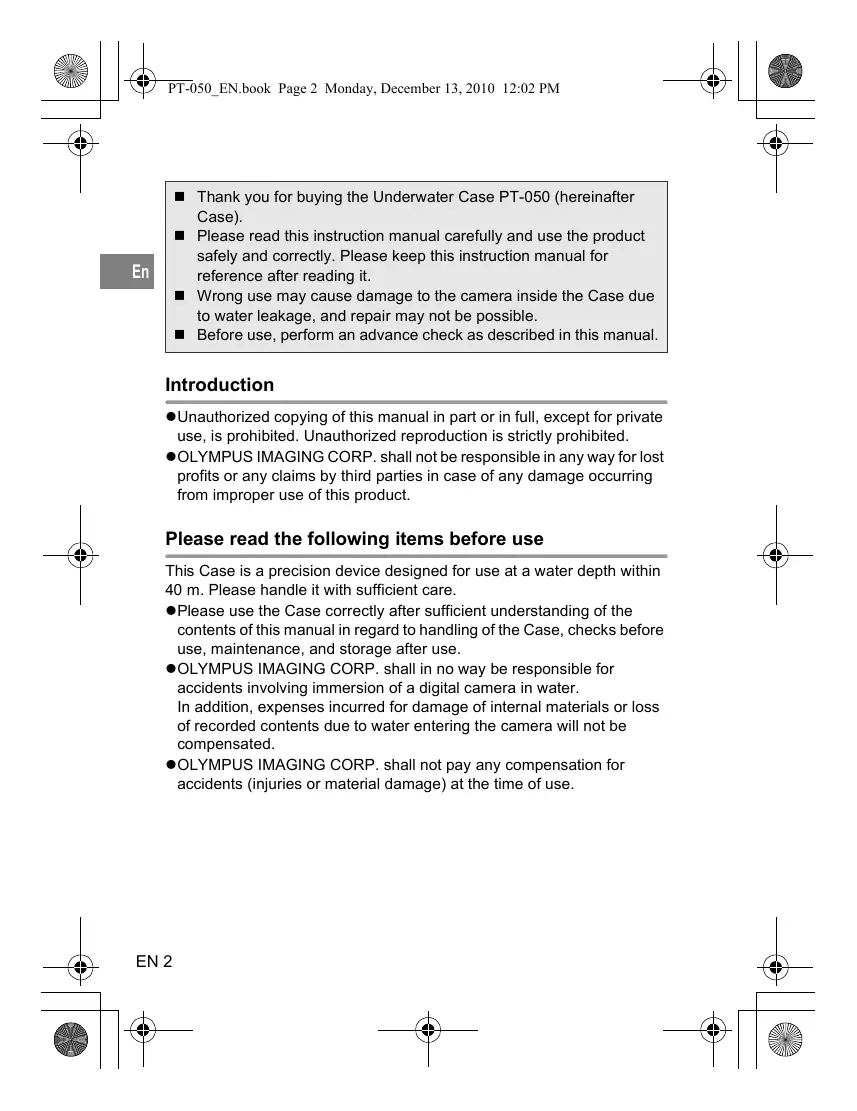 Download the instructions for your Boîtier étanche pour appareil photo in PDF format for free! Find your manual PT-050 - OLYMPUS and take your electronic device back in hand. On this page are published all the documents necessary for the use of your device. PT-050 by OLYMPUS.