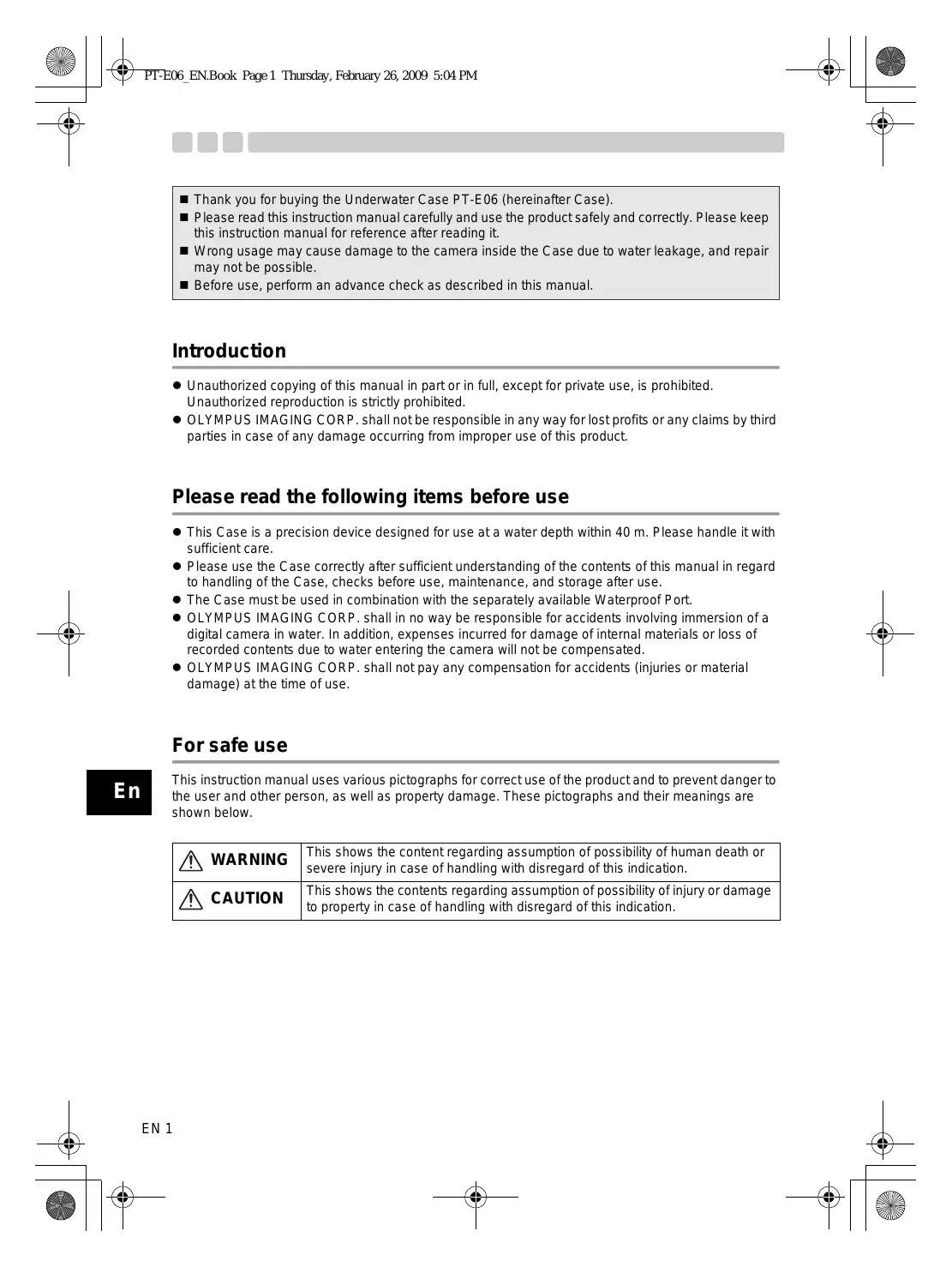 Download the instructions for your Boîtier étanche in PDF format for free! Find your manual PT-E06 - OLYMPUS and take your electronic device back in hand. On this page are published all the documents necessary for the use of your device. PT-E06 by OLYMPUS.