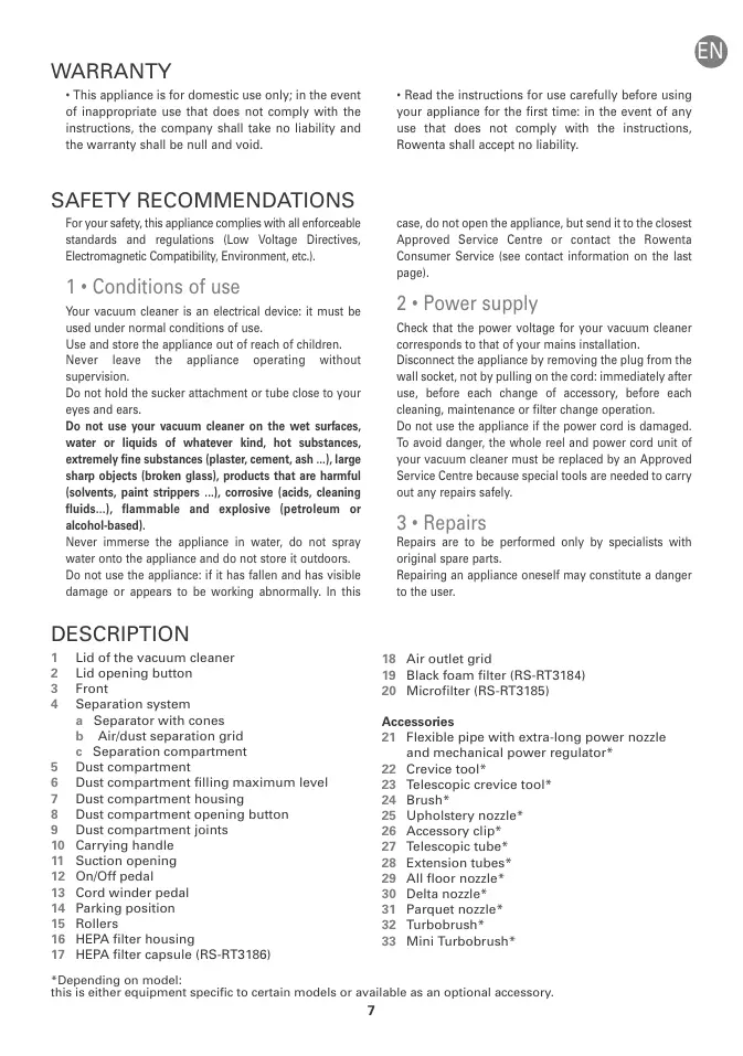 19 Black foam filter (RS-RT3184) 20 Microfilter (RS-RT3185) Accessories 21 Flexible pipe with extra-long power nozzle and mechanical power regulator* 22 Crevice tool* 23 Telescopic crevice tool* 24 Brush* 25 Upholstery nozzle* 26 Accessory clip* 27 Telescopic tube* 28 Extension tubes* 29 All floor nozzle* 30 Delta nozzle* 31 Parquet nozzle* 32 Turbobrush* 33 Mini Turbobrush*