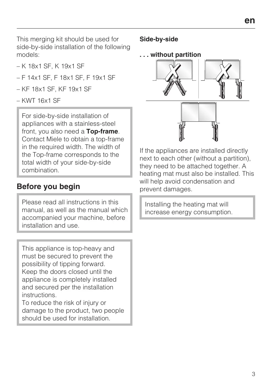 This merging kit should be used for side-by-side installation of the following models: Side-by-side . . . without partition – K 18x1 SF, K 19x1 SF – F 14x1 SF, F 18x1 SF, F 19x1 SF – KF 18x1 SF, KF 19x1 SF – KWT 16x1 SF For side-by-side installation of appliances with a stainless-steel front, you also need a Top-frame. Contact Miele to obtain a top-frame in the required width. The width of the Top-frame corresponds to the total width of your side-by-side combination. Before you begin Please read all instructions in this manual, as well as the manual which accompanied your machine, before installation and use. If the appliances are installed directly next to each other (without a partition), they need to be attached together. A heating mat must also be installed. This will help avoid condensation and prevent damages. Installing the heating mat will increase energy consumption. This appliance is top-heavy and must be secured to prevent the possibility of tipping forward. Keep the doors closed until the appliance is completely installed and secured per the installation instructions. To reduce the risk of injury or damage to the product, two people should be used for installation.
