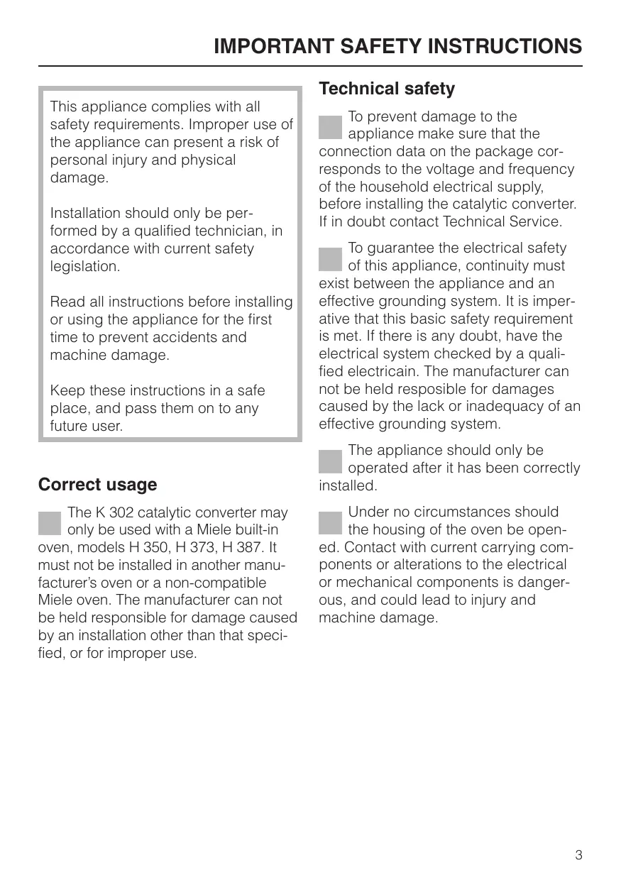 Technical safety This appliance complies with all safety requirements. Improper use of the appliance can present a risk of personal injury and physical damage. Installation should only be performed by a qualified technician, in accordance with current safety legislation. Read all instructions before installing or using the appliance for the first time to prevent accidents and machine damage. Keep these instructions in a safe place, and pass them on to any future user. Correct usage The K 302 catalytic converter may only be used with a Miele built-in oven, models H 350, H 373, H 387. It must not be installed in another manufacturer’s oven or a non-compatible Miele oven. The manufacturer can not be held responsible for damage caused by an installation other than that specified, or for improper use. To prevent damage to the appliance make sure that the connection data on the package corresponds to the voltage and frequency of the household electrical supply, before installing the catalytic converter. If in doubt contact Technical Service. To guarantee the electrical safety of this appliance, continuity must exist between the appliance and an effective grounding system. It is imperative that this basic safety requirement is met. If there is any doubt, have the electrical system checked by a qualified electricain. The manufacturer can not be held resposible for damages caused by the lack or inadequacy of an effective grounding system. The appliance should only be operated after it has been correctly installed. Under no circumstances should the housing of the oven be opened. Contact with current carrying components or alterations to the electrical or mechanical components is dangerous, and could lead to injury and machine damage.