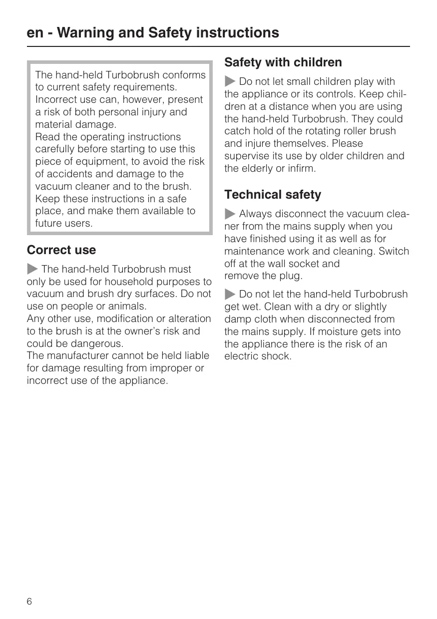 en - Warning and Safety instructions Safety with children The hand-held Turbobrush conforms to current safety requirements. Incorrect use can, however, present a risk of both personal injury and material damage. Read the operating instructions carefully before starting to use this piece of equipment, to avoid the risk of accidents and damage to the vacuum cleaner and to the brush. Keep these instructions in a safe place, and make them available to future users.