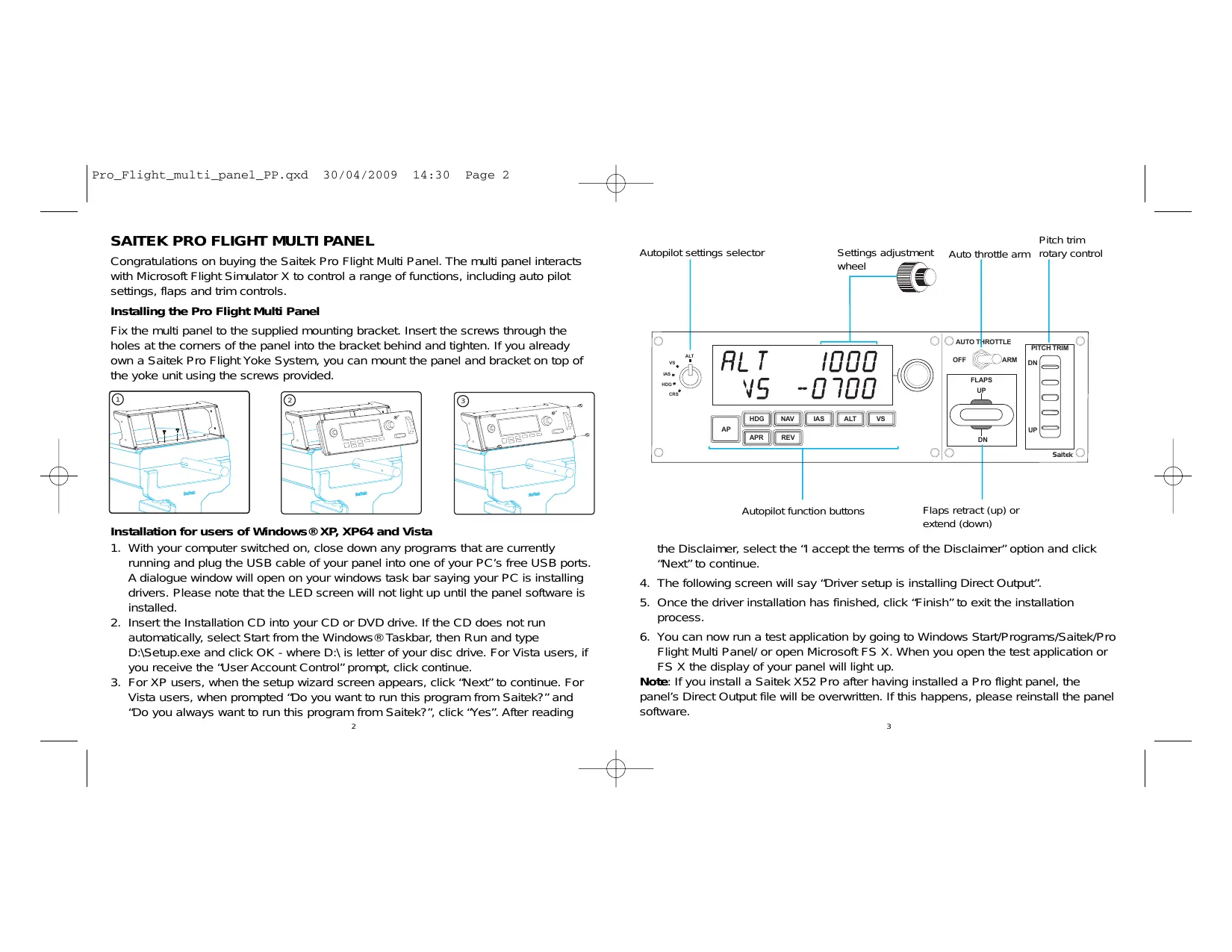 SAITEK PRO FLIGHT MULTI PANEL Congratulations on buying the Saitek Pro Flight Multi Panel. The multi panel interacts with Microsoft Flight Simulator X to control a range of functions, including auto pilot settings, flaps and trim controls.