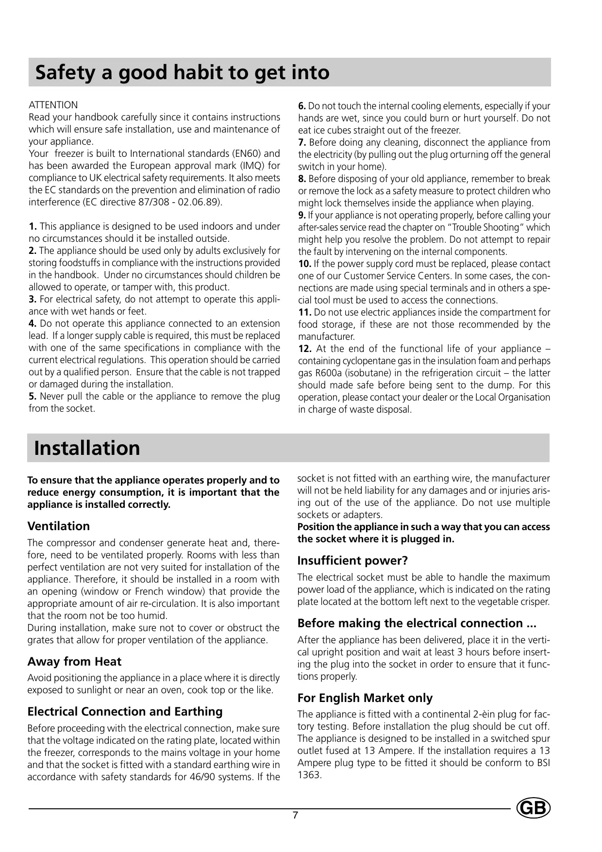 ATTENTION Read your handbook carefully since it contains instructions which will ensure safe installation, use and maintenance of your appliance. Your freezer is built to International standards (EN60) and has been awarded the European approval mark (IMQ) for compliance to UK electrical safety requirements. It also meets the EC standards on the prevention and elimination of radio interference (EC directive 87/308 - 02.06.89). 1. This appliance is designed to be used indoors and under no circumstances should it be installed outside. 2. The appliance should be used only by adults exclusively for storing foodstuffs in compliance with the instructions provided in the handbook. Under no circumstances should children be allowed to operate, or tamper with, this product. 3. For electrical safety, do not attempt to operate this appliance with wet hands or feet. 4. Do not operate this appliance connected to an extension lead. If a longer supply cable is required, this must be replaced with one of the same specifications in compliance with the current electrical regulations. This operation should be carried out by a qualified person. Ensure that the cable is not trapped or damaged during the installation. 5. Never pull the cable or the appliance to remove the plug from the socket.