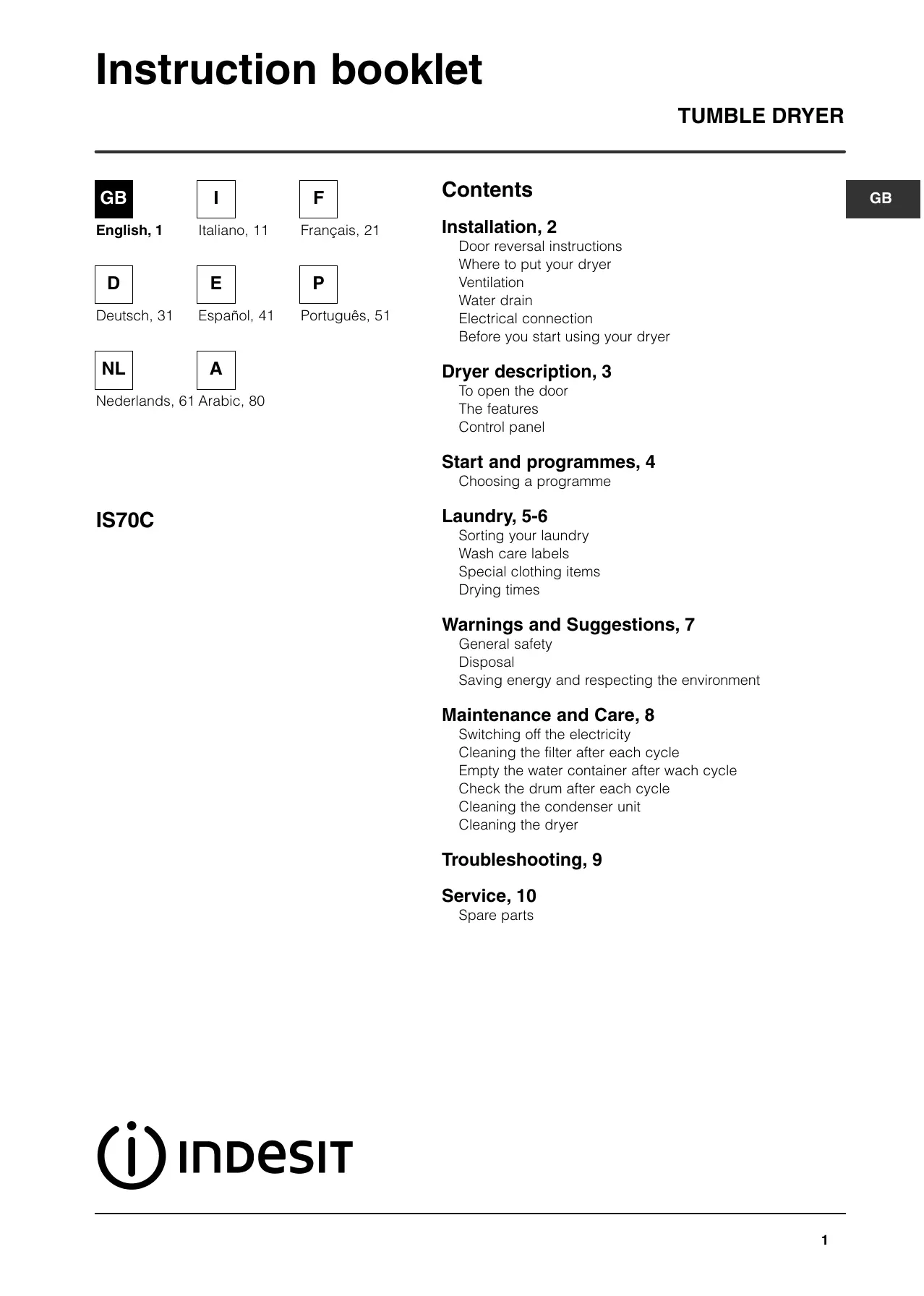 Download the instructions for your Tumble drier in PDF format for free! Find your manual IS70C - INDESIT and take your electronic device back in hand. On this page are published all the documents necessary for the use of your device. IS70C by INDESIT.