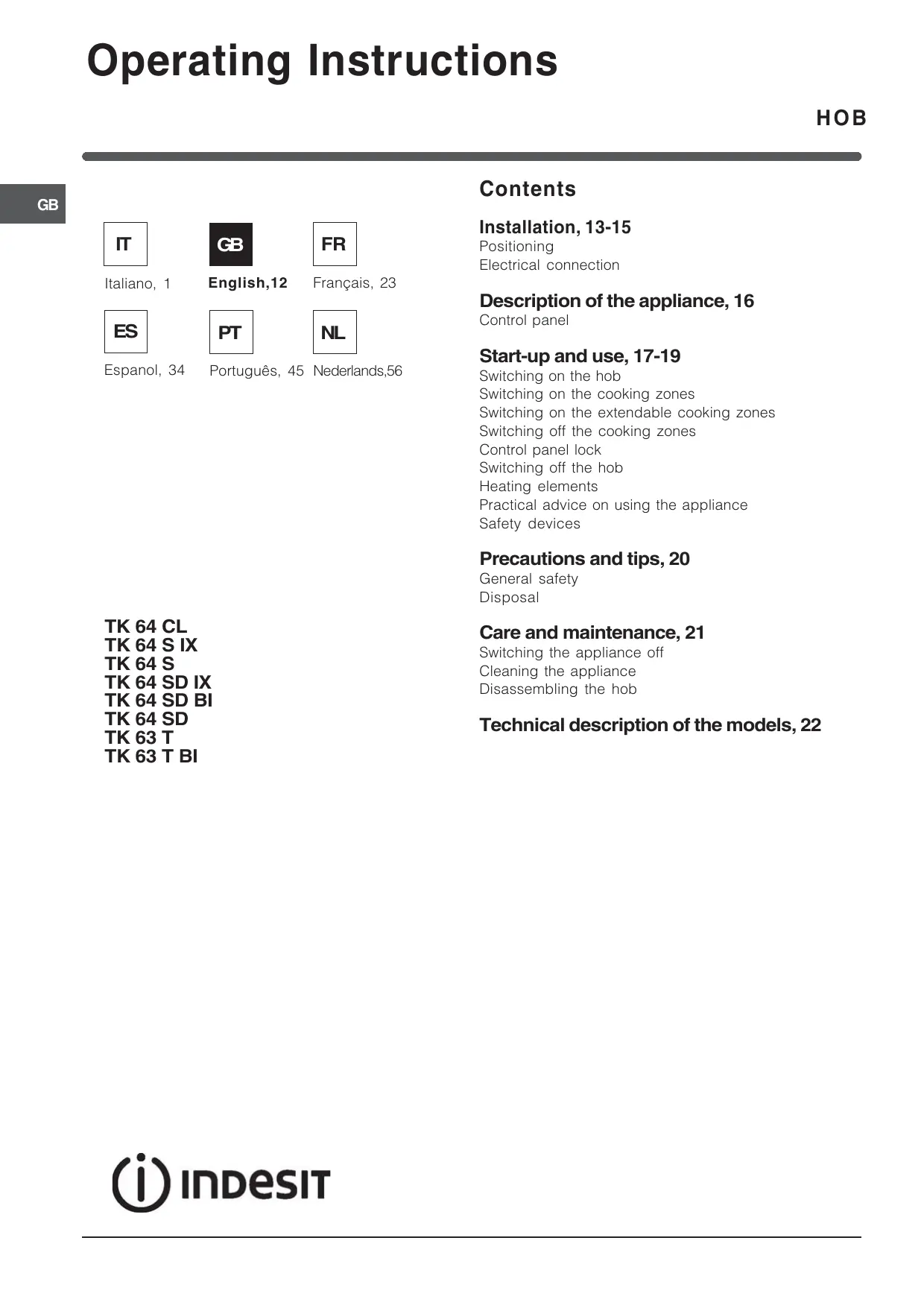 Download the instructions for your Hob in PDF format for free! Find your manual TK 64 S - INDESIT and take your electronic device back in hand. On this page are published all the documents necessary for the use of your device. TK 64 S by INDESIT.