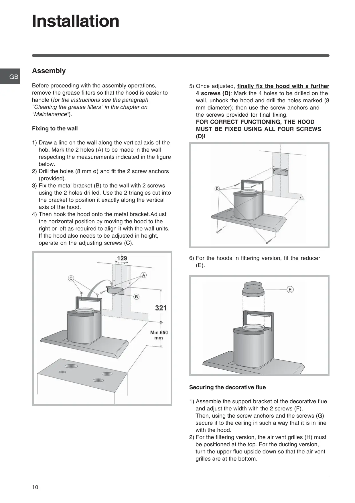4 screws (D): Mark the 4 holes to be drilled on the wall, unhook the hood and drill the holes marked (8 mm diameter); then use the screw anchors and the screws provided for final fixing.