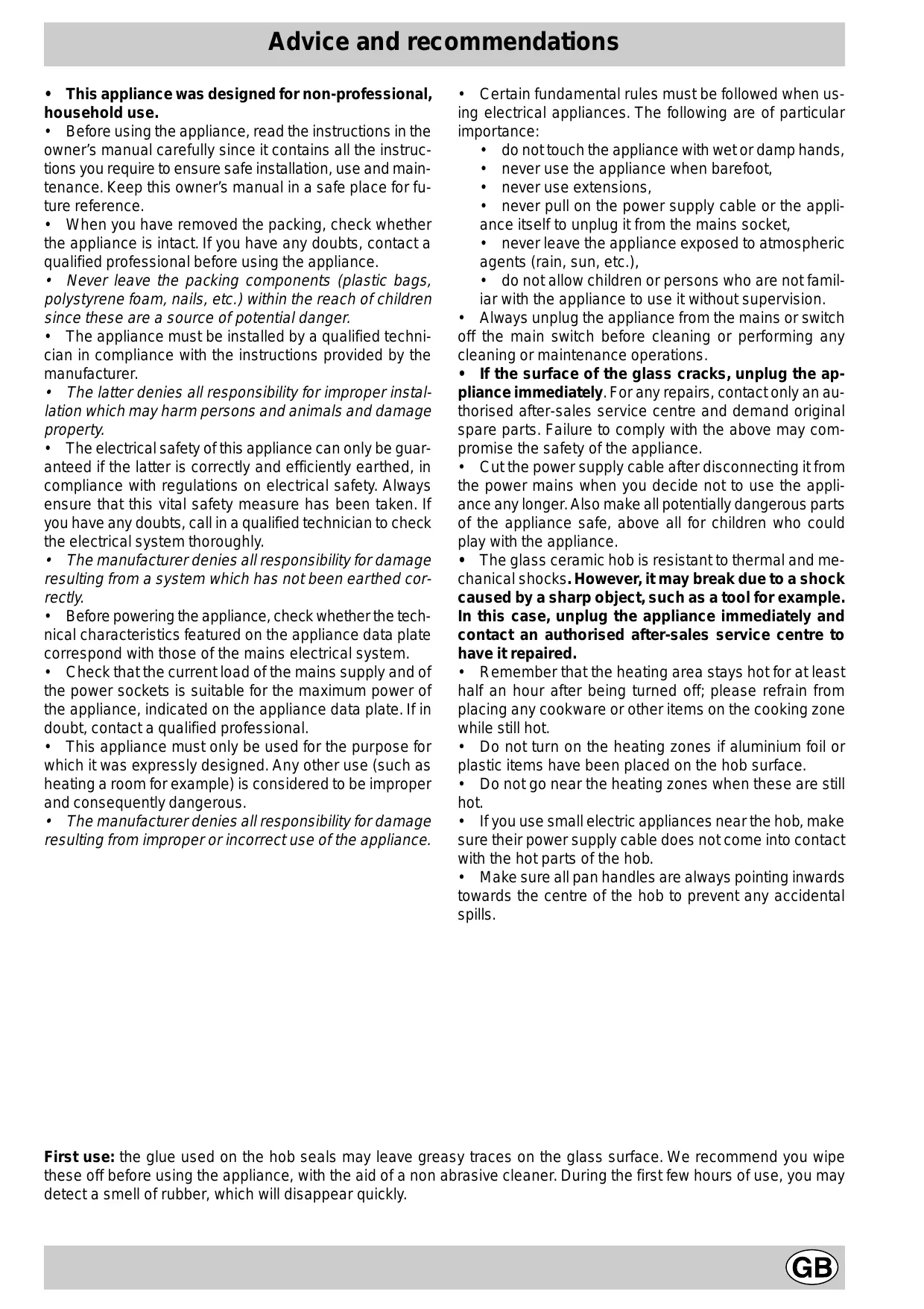 First use: the glue used on the hob seals may leave greasy traces on the glass surface. We recommend you wipe these off before using the appliance, with the aid of a non abrasive cleaner. During the first few hours of use, you may detect a smell of rubber, which will disappear quickly.