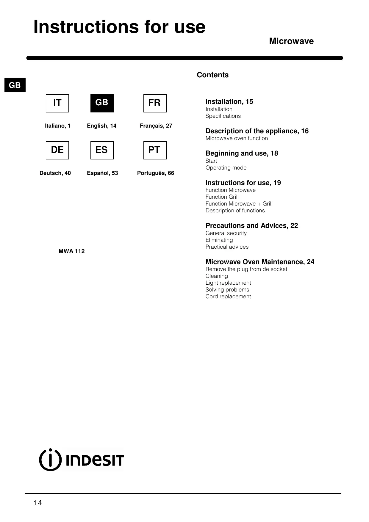 Download the instructions for your Microwave Oven in PDF format for free! Find your manual MWI12IX - INDESIT and take your electronic device back in hand. On this page are published all the documents necessary for the use of your device. MWI12IX by INDESIT.