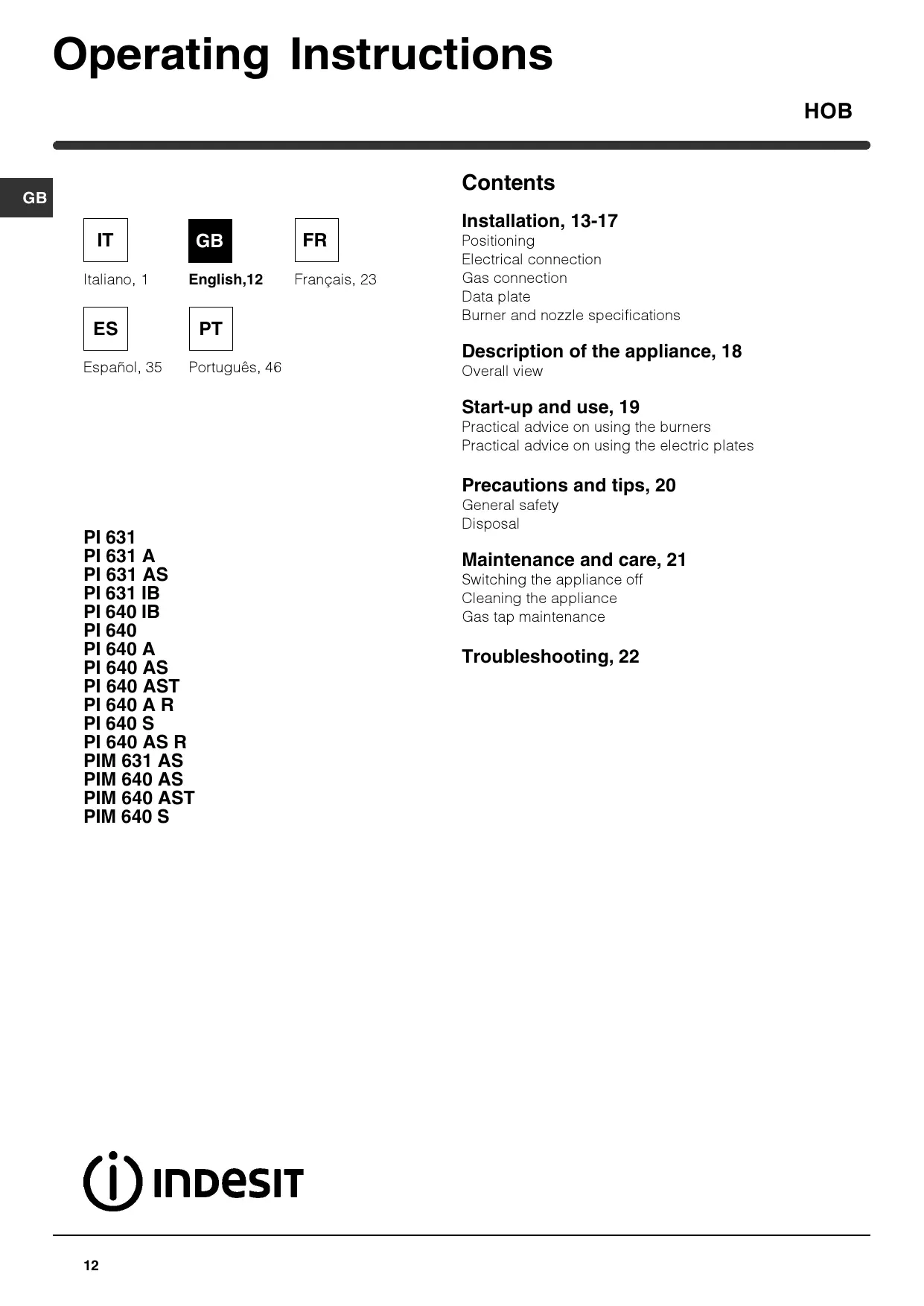 Download the instructions for your Hob in PDF format for free! Find your manual PIM640S - INDESIT and take your electronic device back in hand. On this page are published all the documents necessary for the use of your device. PIM640S by INDESIT.