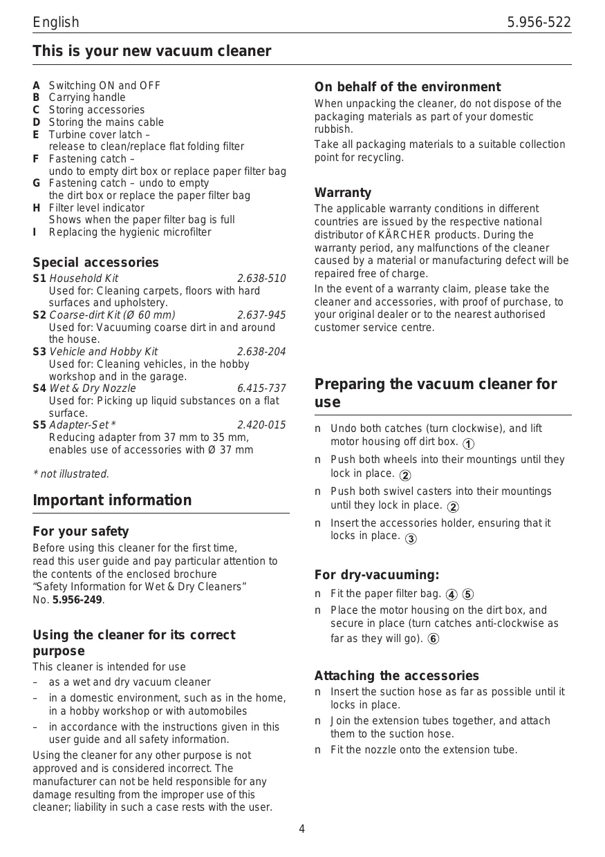 S1 Kit domestique S3 Kit pour la voiture et le bricolage 2.638-204 Exemples d’utilisation: dans la voiture, à l’atelier et au garage. S4 Buse à aspirer les déchets mouillés et secs 6.415-737 Exemples d’utilisation: pour aspirer les déchets mouillés sur surfaces planes. S5 Adaptateur en kit * 2.420-015 Réducteur de 37 à 35 mm de diamètre, a utiliser sur les accessoires à orifice de 37 mm de diamètre