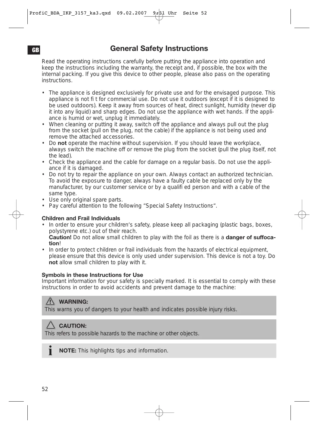 Read the operating instructions carefully before putting the appliance into operation and keep the instructions including the warranty, the receipt and, if possible, the box with the internal packing. If you give this device to other people, please also pass on the operating instructions.