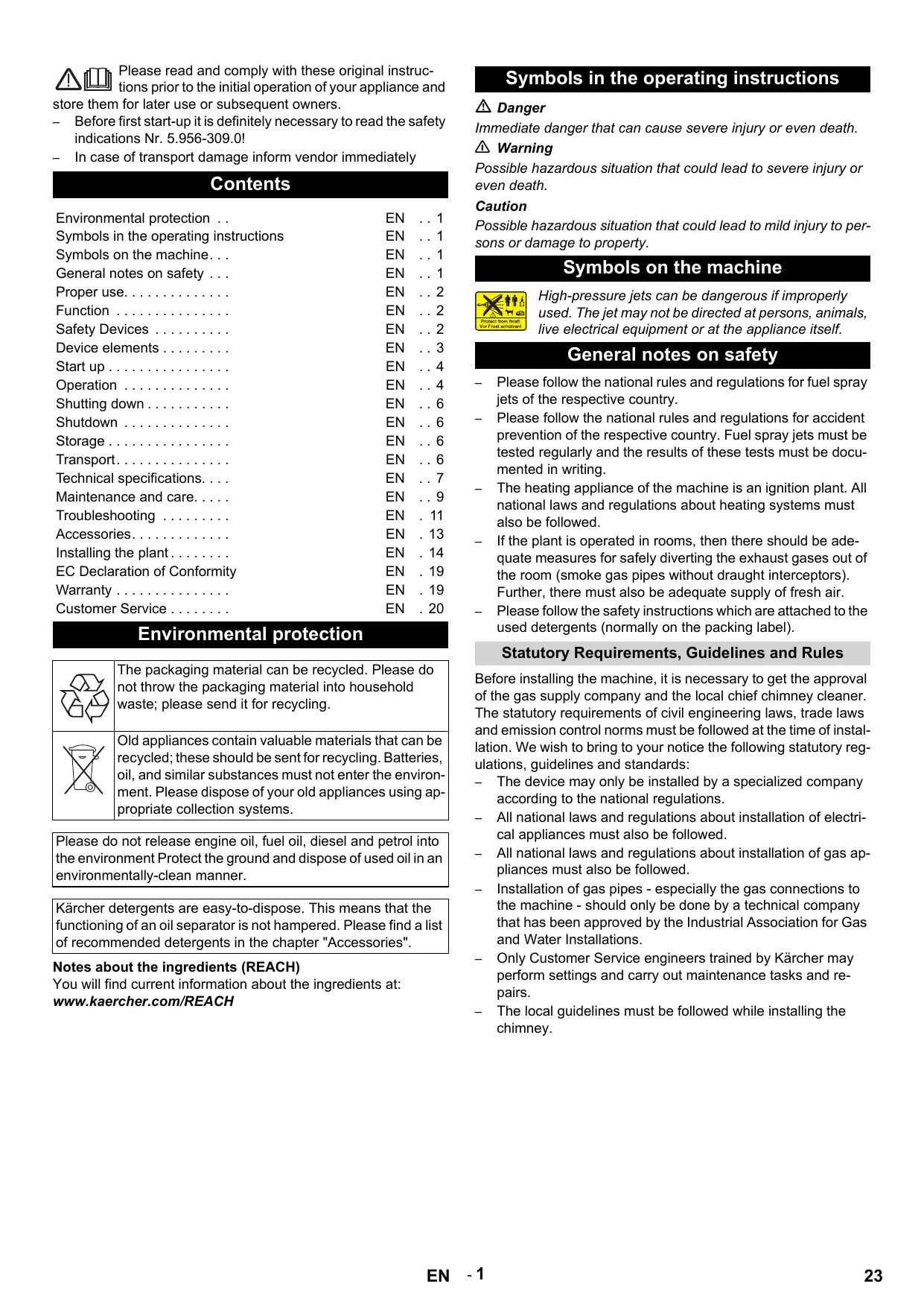 Environmental protection Please follow the national rules and regulations for fuel spray jets of the respective country. Please follow the national rules and regulations for accident prevention of the respective country. Fuel spray jets must be tested regularly and the results of these tests must be documented in writing. The heating appliance of the machine is an ignition plant. All national laws and regulations about heating systems must also be followed. If the plant is operated in rooms, then there should be adequate measures for safely diverting the exhaust gases out of the room (smoke gas pipes without draught interceptors). Further, there must also be adequate supply of fresh air. Please follow the safety instructions which are attached to the used detergents (normally on the packing label). Statutory Requirements, Guidelines and Rules The packaging material can be recycled. Please do not throw the packaging material into household waste; please send it for recycling. Old appliances contain valuable materials that can be recycled; these should be sent for recycling. Batteries, oil, and similar substances must not enter the environment. Please dispose of your old appliances using appropriate collection systems. Please do not release engine oil, fuel oil, diesel and petrol into the environment Protect the ground and dispose of used oil in an environmentally-clean manner. Kärcher detergents are easy-to-dispose. This means that the functioning of an oil separator is not hampered. Please find a list of recommended detergents in the chapter "Accessories". Notes about the ingredients (REACH) You will find current information about the ingredients at: www.kaercher.com/REACH
