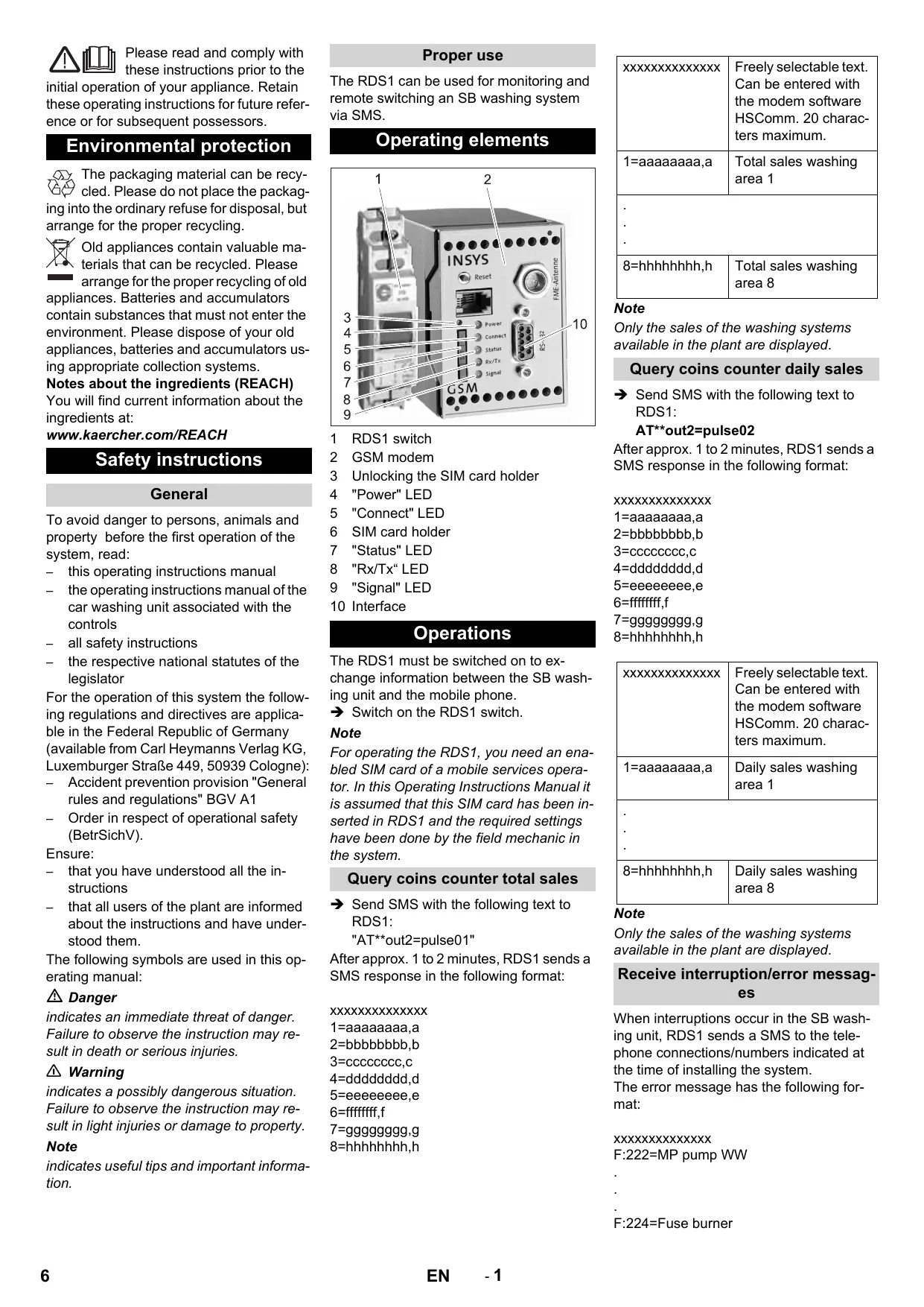 General To avoid danger to persons, animals and property before the first operation of the system, read: – this operating instructions manual – the operating instructions manual of the car washing unit associated with the controls – all safety instructions – the respective national statutes of the legislator For the operation of this system the following regulations and directives are applicable in the Federal Republic of Germany (available from Carl Heymanns Verlag KG, Luxemburger Straße 449, 50939 Cologne): – Accident prevention provision "General rules and regulations" BGV A1 – Order in respect of operational safety (BetrSichV). Ensure: – that you have understood all the instructions – that all users of the plant are informed about the instructions and have understood them. The following symbols are used in this operating manual: Danger indicates an immediate threat of danger. Failure to observe the instruction may result in death or serious injuries. 몇 Warning indicates a possibly dangerous situation. Failure to observe the instruction may result in light injuries or damage to property. Note indicates useful tips and important information.