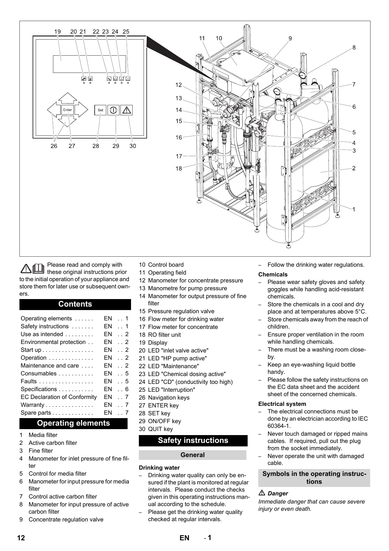 Danger Risk of injury if the plant is not installed properly. Risk to health on account of poorly treated drinking water. The plant may be put into operation only when set-up, installed and prepared for operation by skilled and authorized personnel.