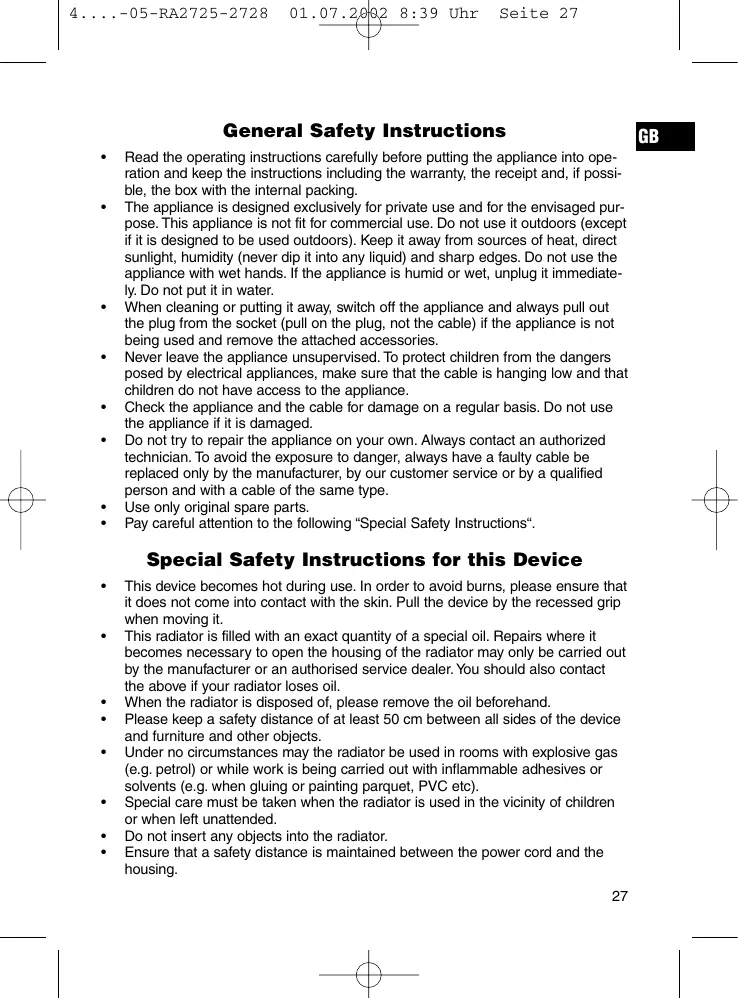 GB Read the operating instructions carefully before putting the appliance into operation and keep the instructions including the warranty, the receipt and, if possible, the box with the internal packing.