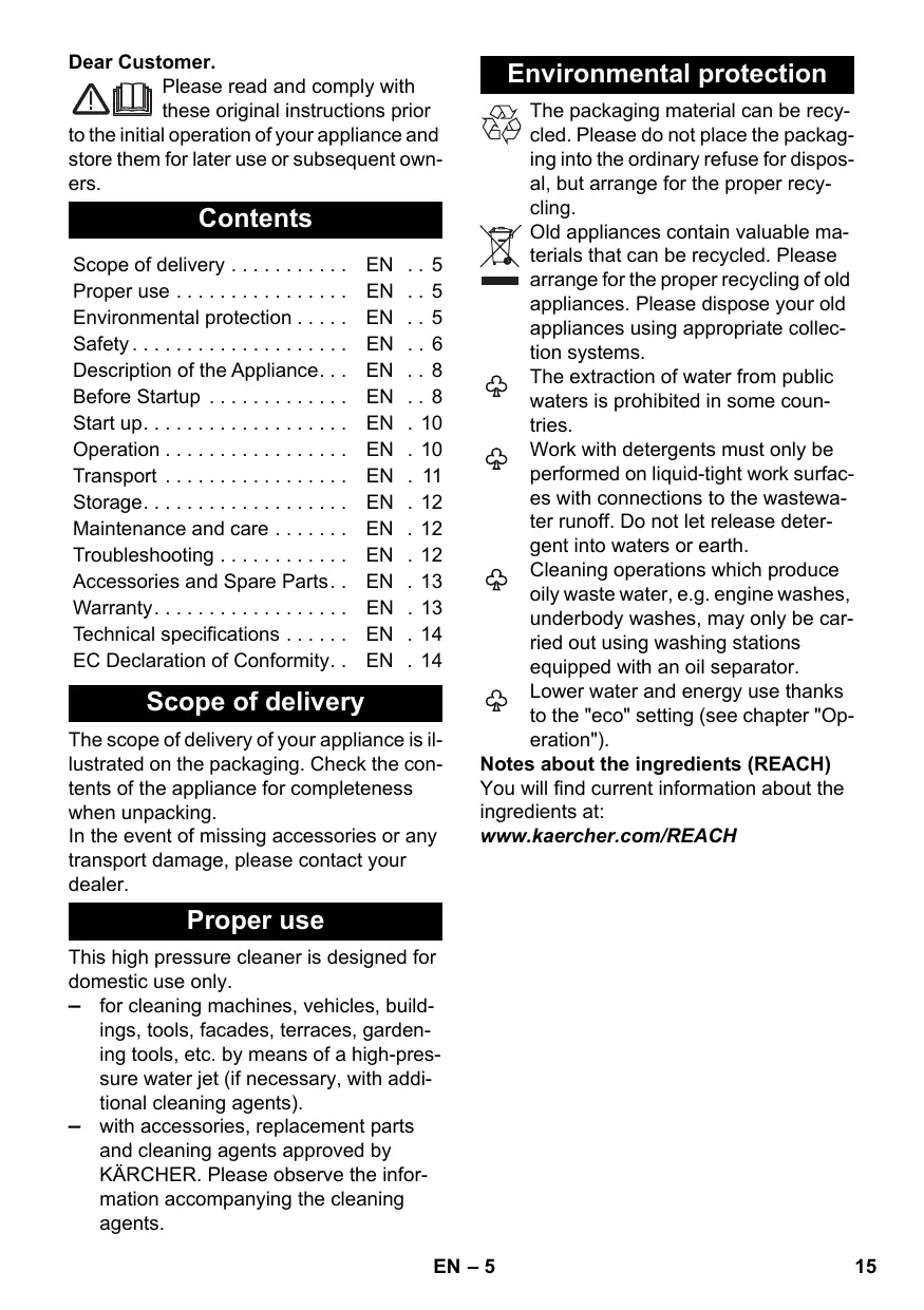 www.kaercher.com/REACH Proper use This high pressure cleaner is designed for domestic use only. – for cleaning machines, vehicles, buildings, tools, facades, terraces, gardening tools, etc. by means of a high-pressure water jet (if necessary, with additional cleaning agents). – with accessories, replacement parts and cleaning agents approved by KÄRCHER. Please observe the information accompanying the cleaning agents. EN – 5
