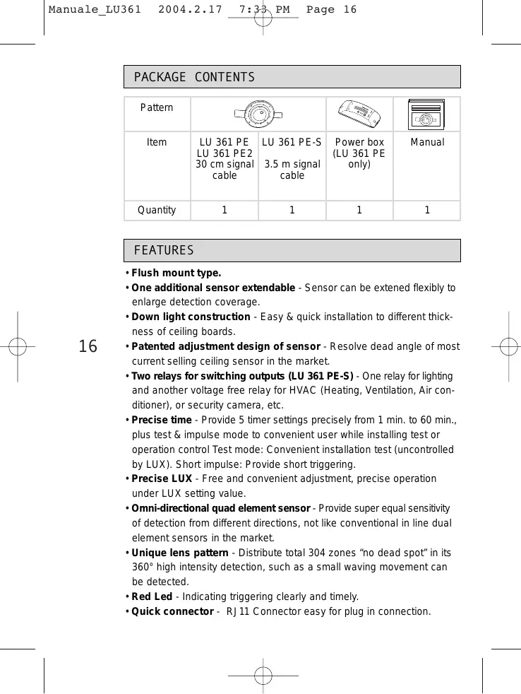 230V ~ 50Hz. LU 361 PE2: Dual independent load control. Load I (L ): 10A max. (cos j =1) Load II (D1-D2):10A max. (cos j =1) voltage free contact (Load II is uncontrolled by LUX value, it can work at any light level). LU 361 PE: Single load control (D1-D2): 10A max (cos j =1) voltage free contact. LU 361 PE-S:Dual independent load control. Sensor with 3.5M cable. (Apply to LU 361 PE2 power box mainly) 360° circular. About 7M diameter at 2.4M height.