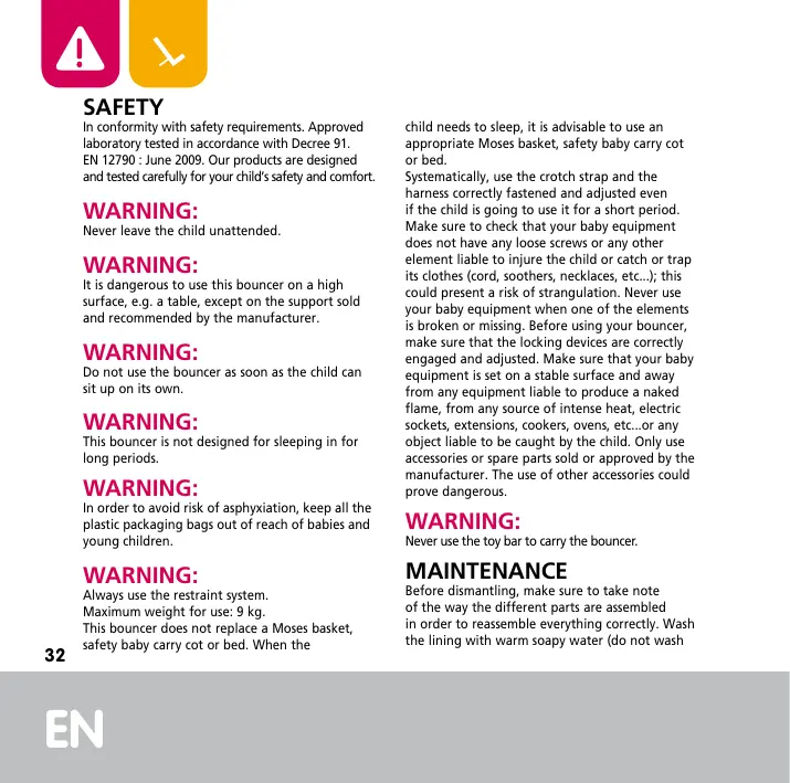 MAINTENANCE Always use the restraint system. Maximum weight for use: 9 kg. This bouncer does not replace a Moses basket, safety baby carry cot or bed. When the