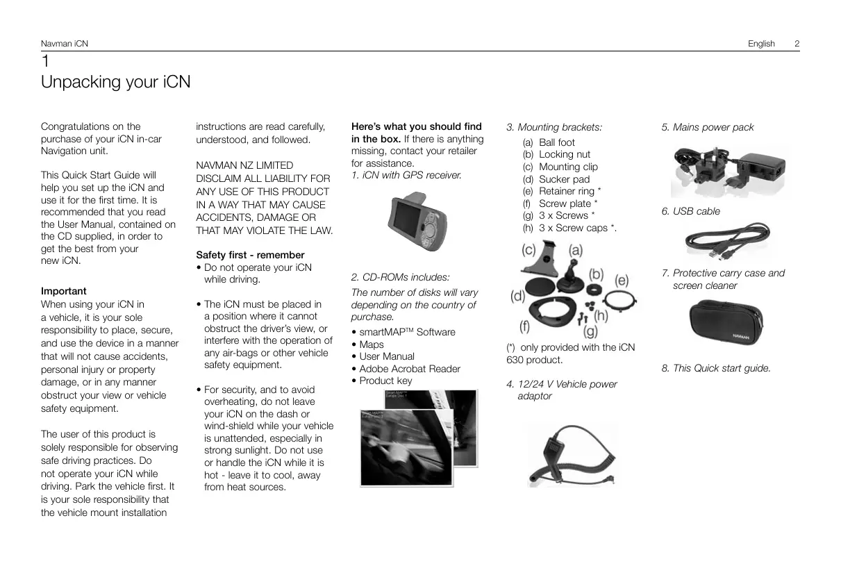 Unpacking your iCN Congratulations on the purchase of your iCN in-car Navigation unit. This Quick Start Guide will help you set up the iCN and use it for the first time. It is recommended that you read the User Manual, contained on the CD supplied, in order to get the best from your new iCN. Important When using your iCN in a vehicle, it is your sole responsibility to place, secure, and use the device in a manner that will not cause accidents, personal injury or property damage, or in any manner obstruct your view or vehicle safety equipment. The user of this product is solely responsible for observing safe driving practices. Do not operate your iCN while driving. Park the vehicle first. It is your sole responsibility that the vehicle mount installation instructions are read carefully, understood, and followed.