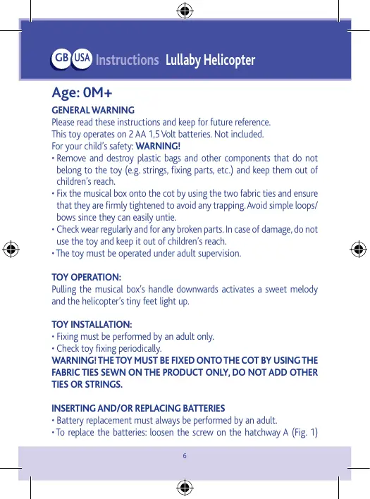 Age: 0M+ GENERAL WARNING Please read these instructions and keep for future reference. This toy operates on 2 AA 1,5 Volt batteries. Not included. For your child’s safety: WARNING! • Remove and destroy plastic bags and other components that do not belong to the toy (e.g. strings, fixing parts, etc.) and keep them out of children’s reach. • Fix the musical box onto the cot by using the two fabric ties and ensure that they are firmly tightened to avoid any trapping. Avoid simple loops/ bows since they can easily untie. • Check wear regularly and for any broken parts. In case of damage, do not use the toy and keep it out of children’s reach. • The toy must be operated under adult supervision. TOY OPERATION: Pulling the musical box’s handle downwards activates a sweet melody and the helicopter’s tiny feet light up. TOY INSTALLATION: • Fixing must be performed by an adult only. • Check toy fixing periodically. WARNING! THE TOY MUST BE FIXED ONTO THE COT BY USING THE FABRIC TIES SEWN ON THE PRODUCT ONLY, DO NOT ADD OTHER TIES OR STRINGS. INSERTING AND/OR REPLACING BATTERIES • Battery replacement must always be performed by an adult. • To replace the batteries: loosen the screw on the hatchway A (Fig. 1) 6