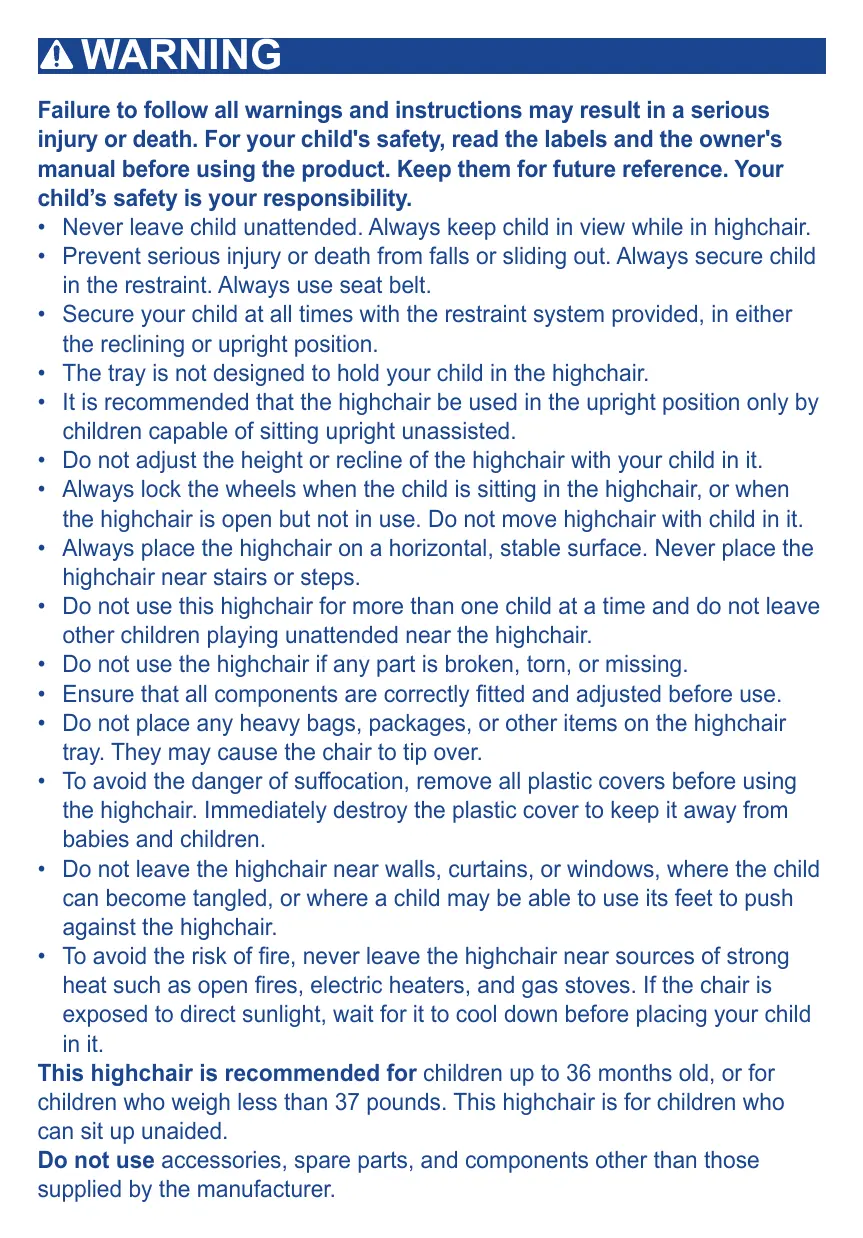 À WARNIN Failure to follow all warnings and instructions may result in a serious injury or death. For your child's safety, read the labels and the owner's manual before using the product. Keep them for future reference. Your child’s safety is your responsibility. + Never leave child unattended. Always keep child in view while in highchair. *_ Prevent serious injury or death from falls or sliding out. Always secure child in the restraint. Always use seat belt. + Secure your child at all times with the restraint system provided, in either the reclining or upright position. + The tray is not designed to hold your child in the highchair. + _Itis recommended that the highchair be used in the upright position only by children capable of sitting upright unassisted. + Do not adjust the height or recline of the highchair with your child in it. + Always lock the wheels when the child is sitting in the highchair, or when the highchair is open but not in use. Do not move highchair with child in it. + Always place the highchair on a horizontal, stable surface. Never place the highchair near stairs or steps. + Do not use this highchair for more than one child at a time and do not leave other children playing unattended near the highchair. + Do not use the highchair if any part is broken, torn, or missing. *_ Ensure that all components are correctly fitted and adjusted before use. + Do not place any heavy bags, packages, or other items on the highchair tray. They may cause the chair to tip over. + To avoid the danger of suffocation, remove all plastic covers before using the highchair. Immediately destroy the plastic cover to keep it away from babies and children. + Do not leave the highchair near walls, curtains, or windows, where the child can become tangled, or where a child may be able to use its feet to push against the highchair. + To avoid the risk of fire, never leave the highchair near sources of strong heat such as open fires, electric heaters, and gas stoves. If the chair is exposed to direct sunlight, wait for it to cool down before placing your child init. This highchair is recommended for children up to 36 months old, or for children who weigh less than 37 pounds. This highchair is for children who can sit up unaided. Do not use accessories, spare parts, and components other than those supplied by the manufacturer.