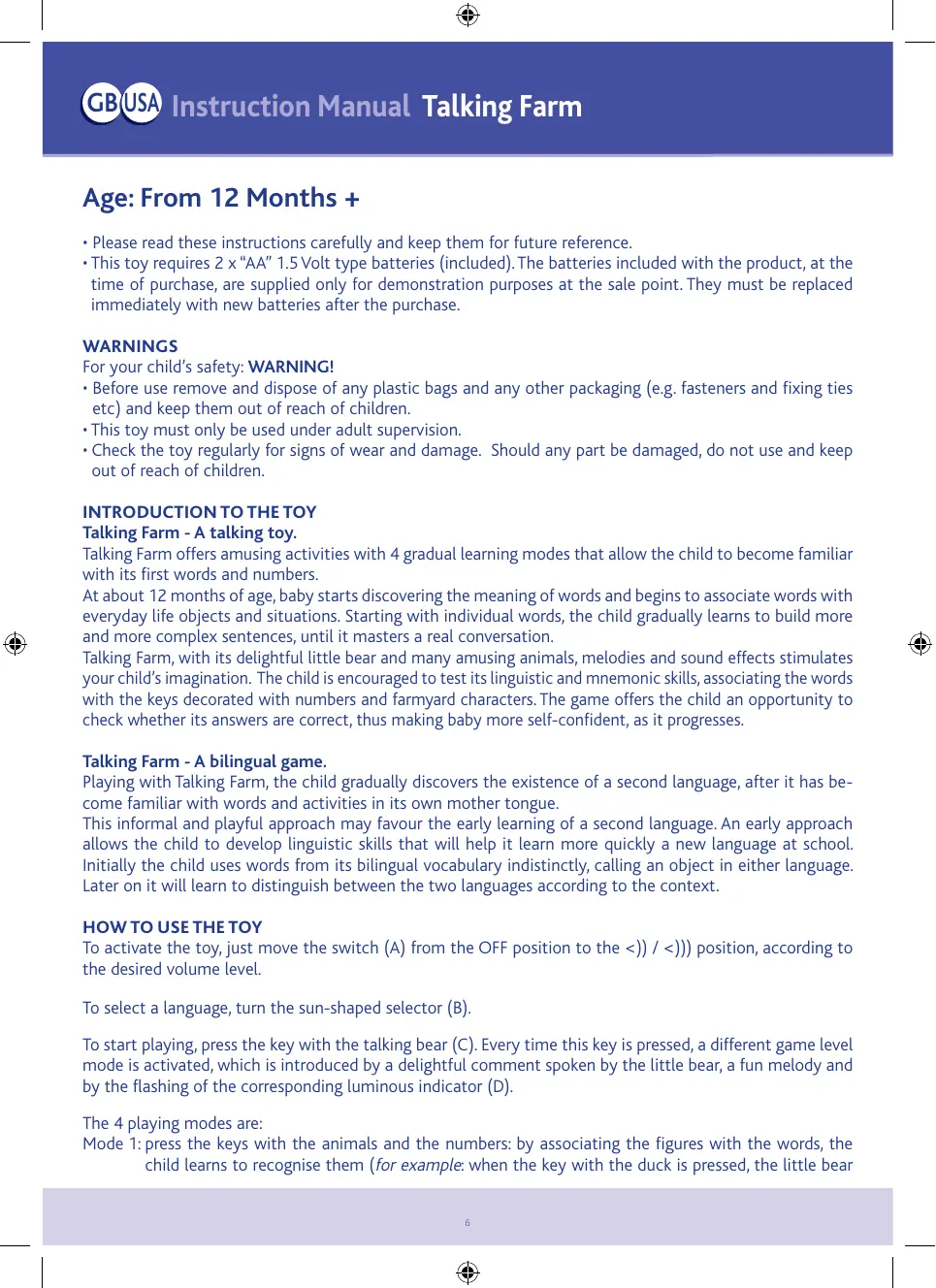 • Le jeu fonctionne avec 2 piles “AA” de 1,5 Volt incluses. Les piles incluses dans le jouet au moment de l’achat sont fournies pour tester le produit en magasin. Il faut donc les remplacer après l’achat. AVERTISSEMENTS Pour la sécurité de votre enfant: ATTENTION! • Avant l’utilisation, ôter et éliminer tous les sachets en plastique éventuels et tous les autres éléments qui ne font pas partie du jouet (par exemple cordons, éléments de fixation, etc...) et les tenir hors de portée des enfants. • Pour l’utilisation, nous recommandons la supervision d’un adulte. • Nous recommandons de vérifier périodiquement l’état d’usure du produit et la présence de détériorations éventuelles. En cas de dommages ne pas utiliser le jouet et le tenir hors de portés des enfants. INTRODUCTION AU JEU Ma Ferme Éducative Bilingue - un jeu interactif. Ma Ferme Éducative Bilingue est un jeu éducatif et interactif. Elle permet à l’enfant d’apprendre les noms et les cris des animaux, les couleurs et les nombres. Vers 12 mois, l’enfant commence en effet à découvrir le sens des mots et à les associer à des objets et à des situations de la vie quotidienne. Partant de mots individuels, l’enfant apprend peu à peu à construire des phrases de plus en plus complexes pour parvenir à établir un véritable dialogue. Avec son sympathique ourson et ses nombreux animaux, ses mélodies et ses effets sonores, Ma Ferme Éducative apprend à l’enfant à expérimenter et à s’amuser progressivement avec les mots, enrichissant ainsi ses capacités linguistiques et de mémorisation avec l’aide des amis de la ferme. La conception du jeu donne en outre à l’enfant la possibilité de vérifier si ses réponses sont correctes et de stimuler sa confiance en soi. Ma Ferme Éducative Bilingue - un jeu bilingue. En jouant avec Ma Ferme Éducative Bilingue l’enfant peut expérimenter à son rythme la découverte d’une langue étrangère une fois familiarisé avec les mots et les activités de jeu dans sa langue maternelle. Une approche détendue et spontanée grâce au divertissement du jeu favorise en effet l’apprentissage précoce d’une langue étrangère. Cette approche permet à l’enfant de développer une sensibilité linguistique qui pourra devenir un outil important pour sa scolarité future. Au début, l’enfant puise dans son vocabulaire bilingue et utilise indistinctement le nom de l’objet dans une langue comme dans l’autre. Ce n’est que plus tard qu’il apprend à distinguer les deux langues en fonction du contexte. FONCTIONNEMENT DU JOUET Pour actionner le jouet, pousser le curseur (A) de la position OFF à la position <)) ou <))) selon le niveau de volume désiré. Pour sélectionner la langue, tourner le sélecteur en forme de soleil (B). Pour commencer à jouer, appuyer sur l’ourson (C). Chaque pression sur le bouton permet de passer au niveau supérieur. A chaque niveau, la voix de l’ourson et une joyeuse mélodie indiquent à l’enfant le mode d’apprentissage ; un indicateur lumineux signale le niveau correspondant (D). Les 4 modes de jeu sont les suivants : Mode 1: a ppuyer sur les boutons avec les animaux et les nombres pour apprendre à les reconnaître (exemple : en appuyant sur le bouton du canard, la voix de l’ourson dit “le canard jaune”) 9