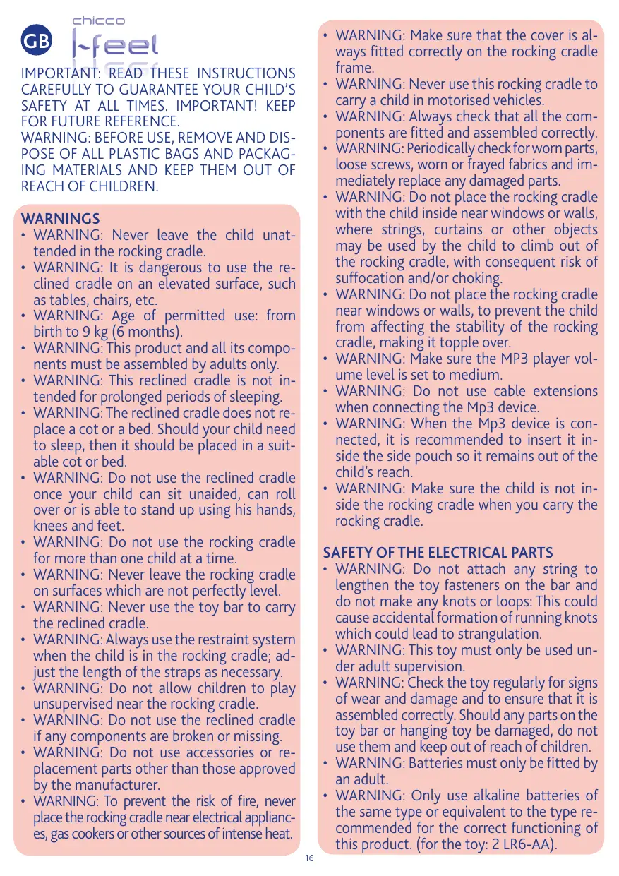 - WARNING: Periodically inspect the rocking cradle to check for broken, torn or missing parts: if this is the case, do not use it.