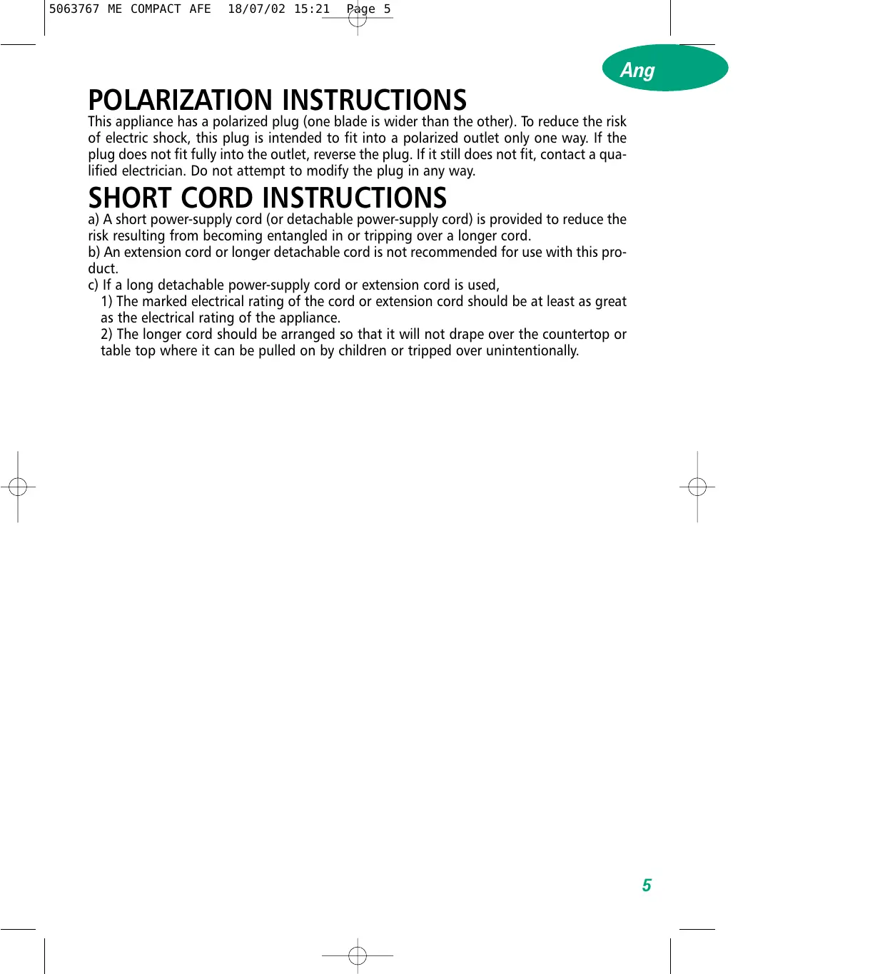 18/07/02 15:21 Page 5 Ang POLARIZATION INSTRUCTIONS This appliance has a polarized plug (one blade is wider than the other). To reduce the risk of electric shock, this plug is intended to fit into a polarized outlet only one way. If the plug does not fit fully into the outlet, reverse the plug. If it still does not fit, contact a qualified electrician. Do not attempt to modify the plug in any way.