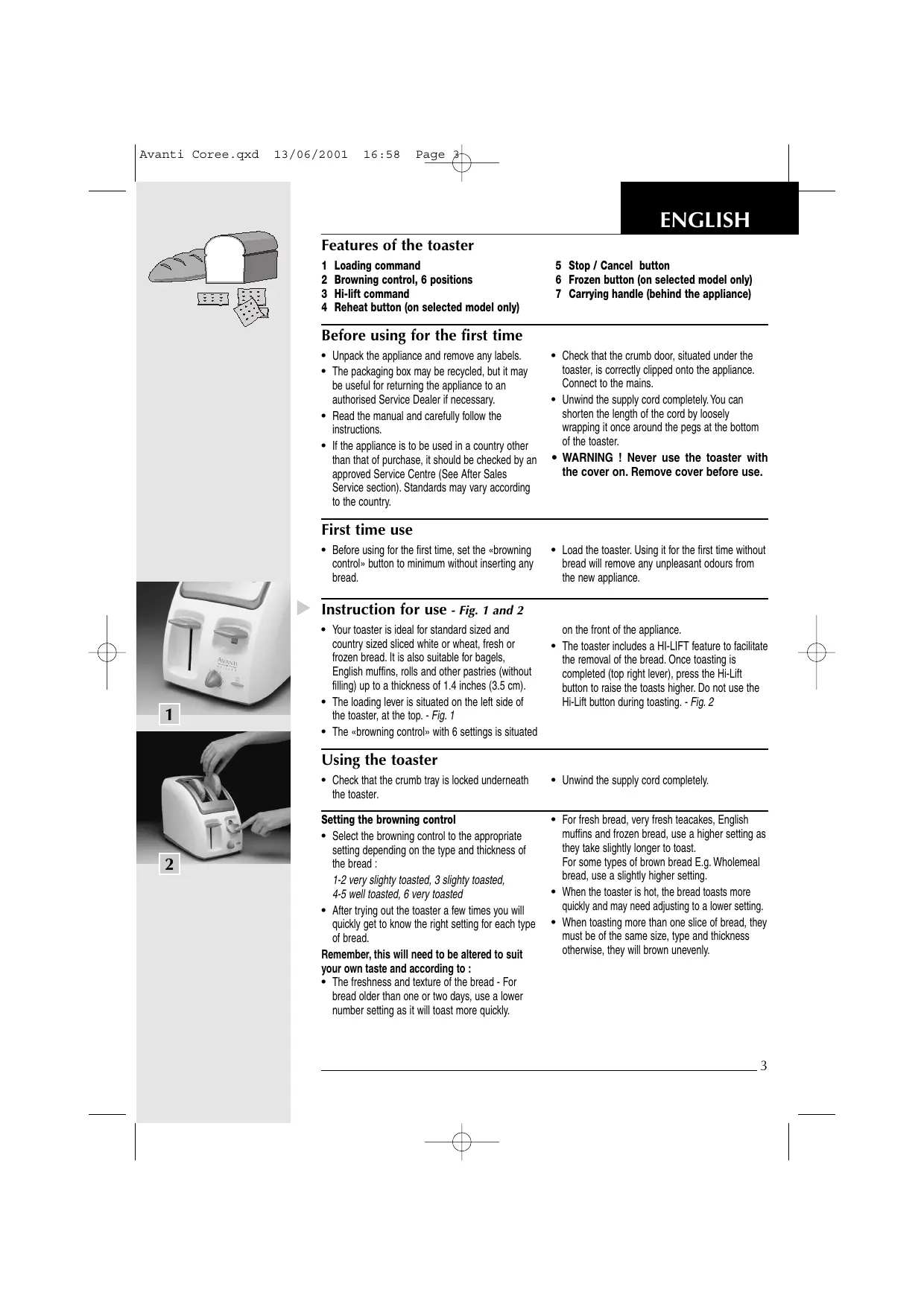 Before using for the first time Unpack the appliance and remove any labels. The packaging box may be recycled, but it may be useful for retuming the appliance to an authorised Service Dealer if necessary. Read the manual and carefuly follow the instructions. Ithe appliance is to be used in a country other than that of purchase, it should be checked by an approved Service Centre (See After Sales Service section). Standards may vary according to the country. + Check that the crumb door situated under the toaster, is correcly clipped onto the applance. Connect to the mains. Unwind the supply cord completely. You can shorten the length of he cord by loosely wrapping it once around the pegs at the bottom of the toaster. WARNING ! Never use the toaster with the cover on. Remove cover before use. First time use + Before using for he first time, set the «browning control» button to minimum without insertng any bread. Load the toaster. Using it for the first ime without bread wil remove any unpleasant odours from the new applance Instruction for use - Fig. 1 and 2 + Your toaster ideal for standard sized and country sized sliced white or wheat, fresh or frozen bread. is also suitable for bagels, English mufins, rols and other pastres (without filing) up to a thickness of 1.4 inches (3.5 cm). +_The loading lever is situated on he le side of the toaster, at the top. - Fig. 1 +_ The <brouning controb» with 6 setings is situated on the front of the appliance. The toaster includes à HI-LIFT feature to faciltate Pa the removal of the bread. Once toasting is SA completed (top right leve), press the H-Lit button to raise the toasts higher. Do not use the Hi button during toasting.- Fig. 2 Using the toaster + Check that the crumb tray is locked underneath the toaster. Unwind the supply cord complete Setting the browning control + Select the brouning control to the appropriate setting depending on the type and thickness of the bread 1-2 very slighty toasted, 3 slighy toasted, 4-5 well toasted, 6 very toasted + Aer ying out the toaster a few times you will quickly get to know the right seting for each type of bread. Remember, this will need to be altered to suit your own taste and according to : + The freshness and texture of he bread - For bread older than one or bo days, use à lower number seting as it il toast more quick. For iesh bread, very fresh eacakes, English muffins and frozen bread, use a higher setting as they take slighty longer to toast. For some types of broun bread E.g. Wholemeall bread, use a slghy higher setting When the toaster is hot, the bread toasts more quick and may need adjusting to a lower seting. When toasting more than one slice of bread, they must be of the same size, type and thickness otheruise, hey wil broun uneveniy.