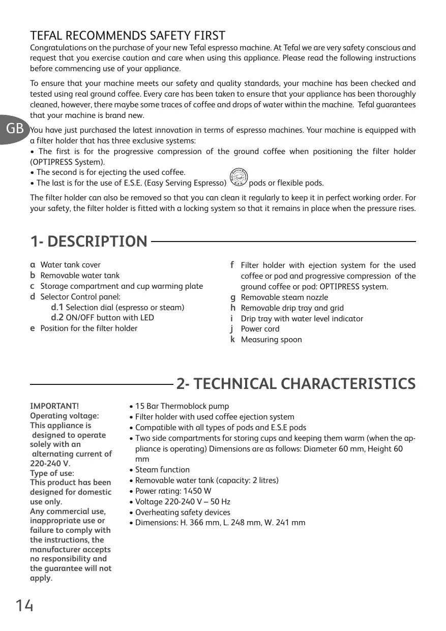 Congratulations on the purchase of your new Tefal espresso machine. At Tefal we are very safety conscious and request that you exercise caution and care when using this appliance. Please read the following instructions before commencing use of your appliance.