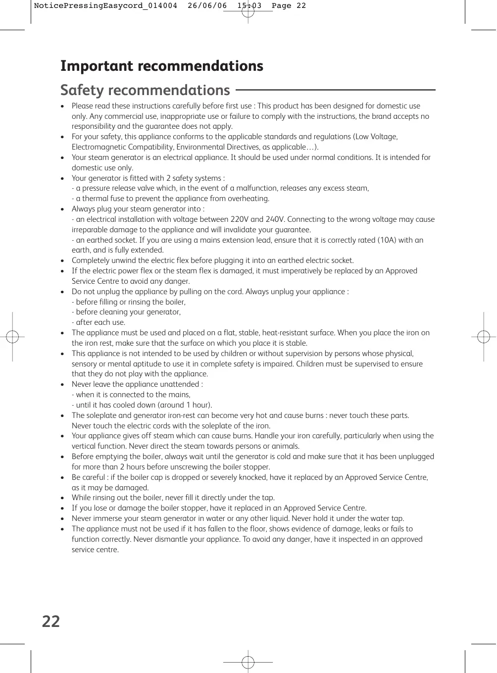 - If the electric power flex or the steam flex is damaged, it must imperatively be replaced by an Approved Service Centre to avoid any danger.