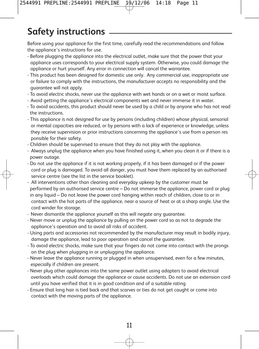 Before using your appliance for the first time, carefully read the recommendations and follow the appliance’s instructions for use. - Before plugging the appliance into the electrical outlet, make sure that the power that your appliance uses corresponds to your electrical supply system. Otherwise, you could damage the appliance or hurt yourself. Any error in connection will cancel the warrantee. - This product has been designed for domestic use only. Any commercial use, inappropriate use or failure to comply with the instructions, the manufacturer accepts no responsibility and the guarantee will not apply. - To avoid electric shocks, never use the appliance with wet hands or on a wet or moist surface. - Avoid getting the appliance’s electrical components wet and never immerse it in water. - To avoid accidents, this product should never be used by a child or by anyone who has not read the instructions. - This appliance is not designed for use by persons (including children) whose physical, sensorial or mental capacities are reduced, or by persons with a lack of experience or knowledge, unless they receive supervision or prior instructions concerning the appliance’s use from a person res ponsible for their safety. - Children should be supervised to ensure that they do not play with the appliance. - Always unplug the appliance when you have finished using it, when you clean it or if there is a power outage. - Do not use the appliance if it is not working properly, if it has been damaged or if the power cord or plug is damaged. To avoid all danger, you must have them replaced by an authorised service centre (see the list in the service booklet). - All interventions other than cleaning and everyday upkeep by the customer must be performed by an authorised service centre – Do not immerse the appliance, power cord or plug in any liquid – Do not leave the power cord hanging within reach of children, close to or in contact with the hot parts of the appliance, near a source of heat or at a sharp angle. Use the cord winder for storage. - Never dismantle the appliance yourself as this will negate any guarantee. - Never move or unplug the appliance by pulling on the power cord so as not to degrade the appliance’s operation and to avoid all risks of accident. - Using parts and accessories not recommended by the manufacturer may result in bodily injury, damage the appliance, lead to poor operation and cancel the guarantee. - To avoid electric shocks, make sure that your fingers do not come into contact with the prongs on the plug when plugging in or unplugging the appliance. - Never leave the appliance running or plugged in when unsupervised, even for a few minutes, especially if children are present. - Never plug other appliances into the same power outlet using adapters to avoid electrical overloads which could damage the appliance or cause accidents. Do not use an extension cord until you have verified that it is in good condition and of a suitable rating - Ensure that long hair is tied back and that scarves or ties do not get caught or come into contact with the moving parts of the appliance.