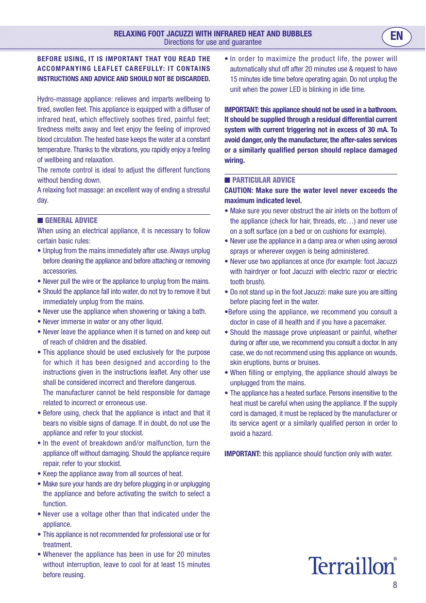 15 minutes idle time before operating again. Do not unplug the unit when the power LED is blinking in idle time. IMPORTANT: this appliance should not be used in a bathroom. It should be supplied through a residual differential current system with current triggering not in excess of 30 mA. To avoid danger, only the manufacturer, the after-sales services or a similarly qualified person should replace damaged wiring. ■ PARTICULAR ADVICE CAUTION: Make sure the water level never exceeds the maximum indicated level. • Make sure you never obstruct the air inlets on the bottom of the appliance (check for hair, threads, etc…) and never use on a soft surface (on a bed or on cushions for example). • Never use the appliance in a damp area or when using aerosol sprays or wherever oxygen is being administered. • Never use two appliances at once (for example: foot Jacuzzi with hairdryer or foot Jacuzzi with electric razor or electric tooth brush). • Do not stand up in the foot Jacuzzi: make sure you are sitting before placing feet in the water. •Before using the appliance, we recommend you consult a doctor in case of ill health and if you have a pacemaker. • Should the massage prove unpleasant or painful, whether during or after use, we recommend you consult a doctor. In any case, we do not recommend using this appliance on wounds, skin eruptions, burns or bruises. • When filling or emptying, the appliance should always be unplugged from the mains. • The appliance has a heated surface. Persons insensitive to the heat must be careful when using the appliance. If the supply cord is damaged, it must be replaced by the manufacturer or its service agent or a similarly qualified person in order to avoid a hazard. IMPORTANT: this appliance should function only with water.