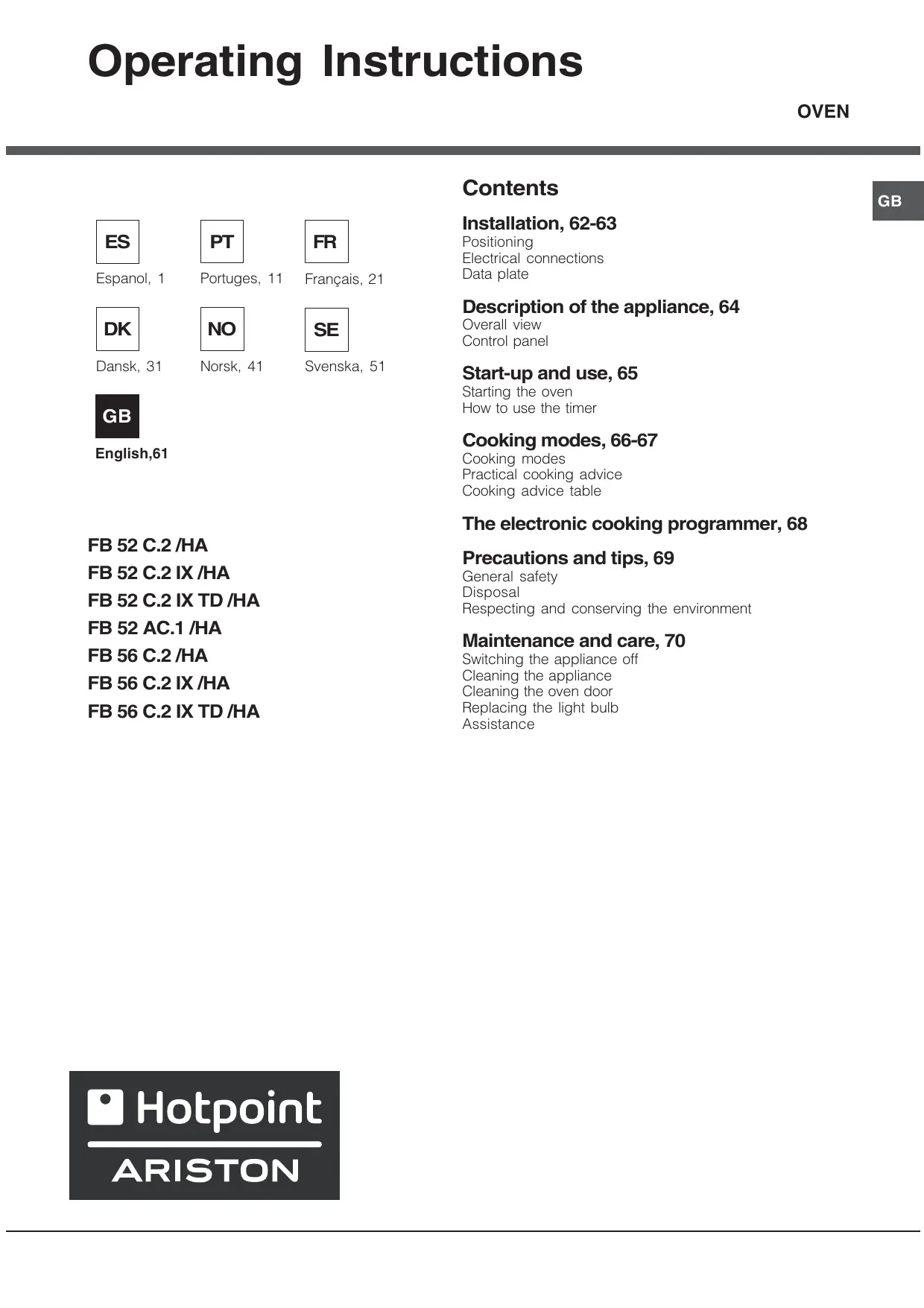 Operating Instructions OVEN Contents es Installation, 62-63 ES PT FR Positioning Electrical connections Espanol, 1 Portuges, 11 Français, 21 Data plate Description of the appliance, 64 DK NO SE Overall view Control panel Dansk, 31 Norsk, 41 Svenska, 51 Start-up and use, 65 Starting the oven 8 | How to use the timer u Cooking modes, 66-67 English,61 Cooking modes Practical cooking advice Cooking advice table The electronic cooking programmer, 68 FB 52 C.2/HA ... Precautions and tips, 69 FB 52 C.21IX/HA General safety FB 52 C.2IX TD /HA Deposal " Respecting and conserving the environment FB 52 AC.1 /HA : Maintenance and care, 70 FB 56 C.2/HA Switching the appliance off Cleaning the appliance FB 56 C.21X/HA Cleaning the oven door FB 56 C.2 IX TD /HA Replacing the light bulb Assistance B Hotpoint ARISTON
